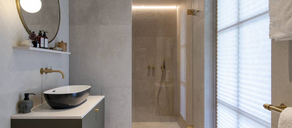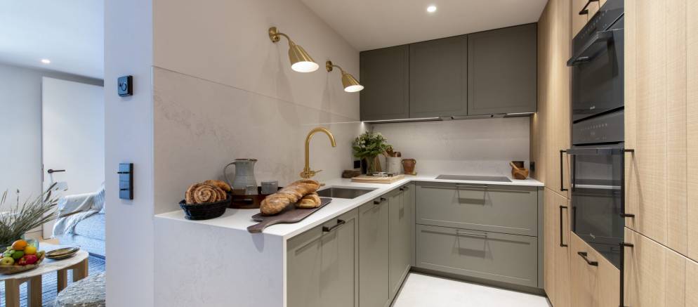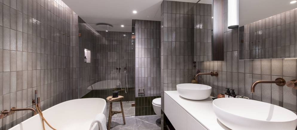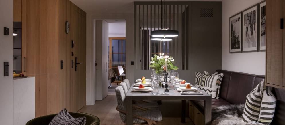 The Brunnenhof 12 apartment is located on the third floor and can accommodate 6 guests in three en-suite bedrooms. Arranged over 97m2 of living space, the wonderfully bright open plan living and dining room is decorated in a fresh and modern style. Featuring neutral hues and moss green accents, the living area has a cosy ambiance which is enhanced by the fireplace.