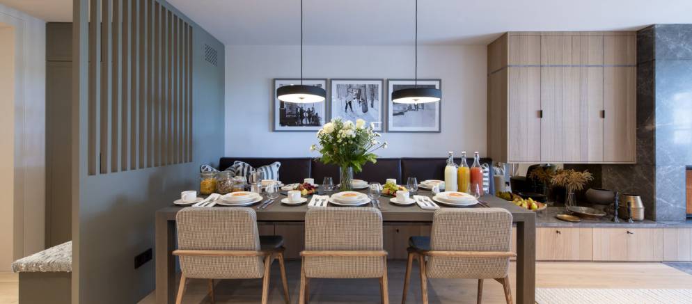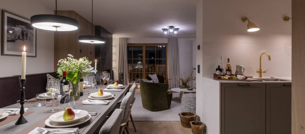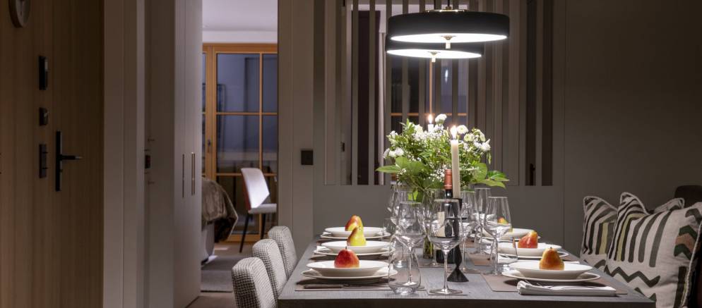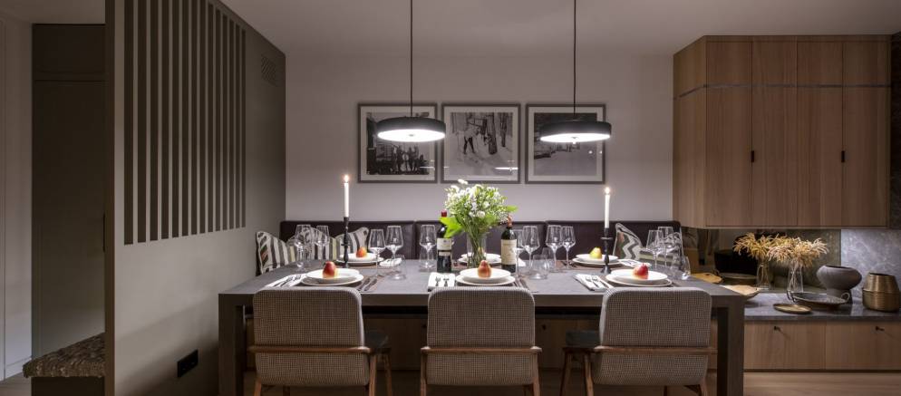 The elegant dining area comfortably seats six guests and the atmospheric lighting perfect for evening dinner parties with friends or family. The modern open plan kitchen is well equipped for preparing meals in when not dining out.