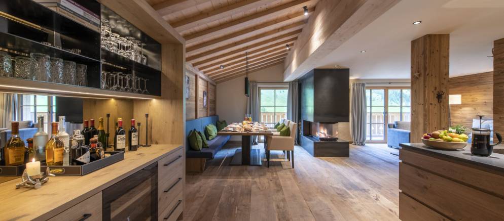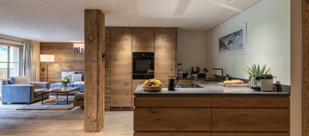 The Brunnenhof 13 apartment is located on the third floor and can accommodate 8-10 guests in four bedrooms. Arranged over 133m2 of living space, the well-designed layout offers plenty of options for relaxation, dining and entertainment. The contemporary decoration also plays homage to the local, traditional Alpine style to create a thoroughly desirable mountain home.