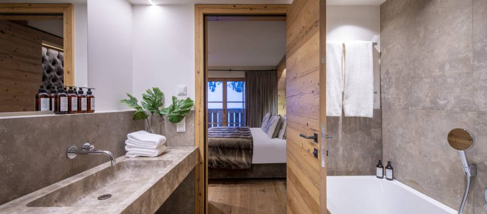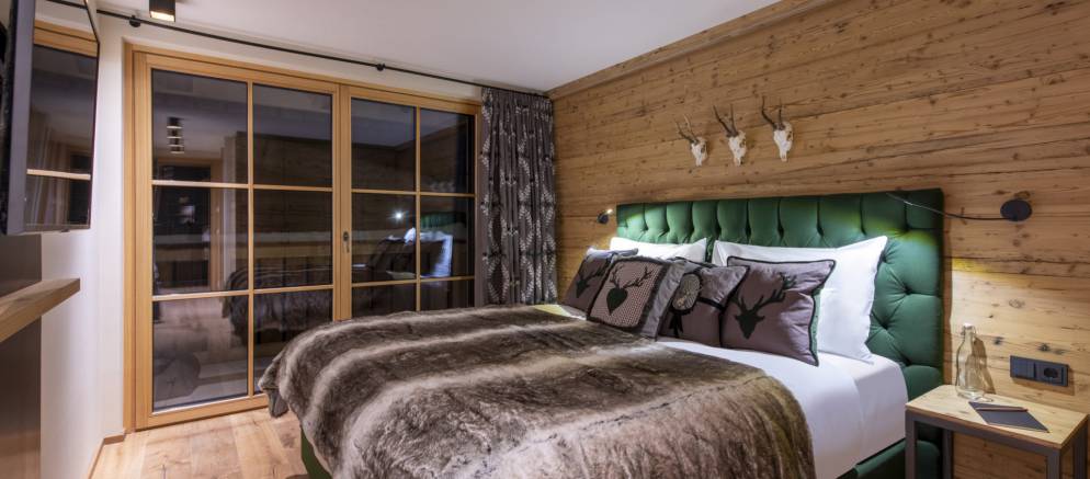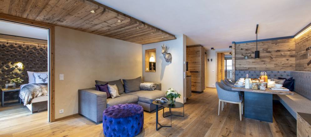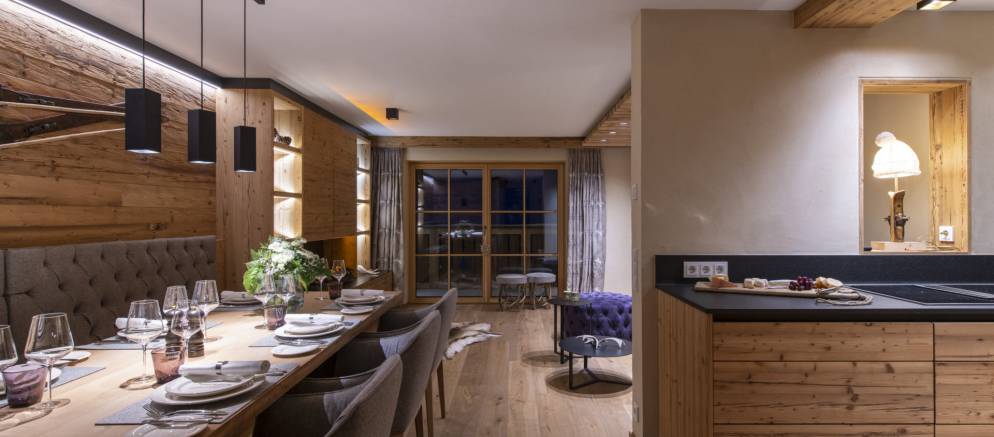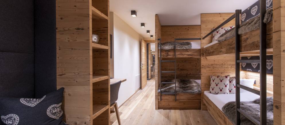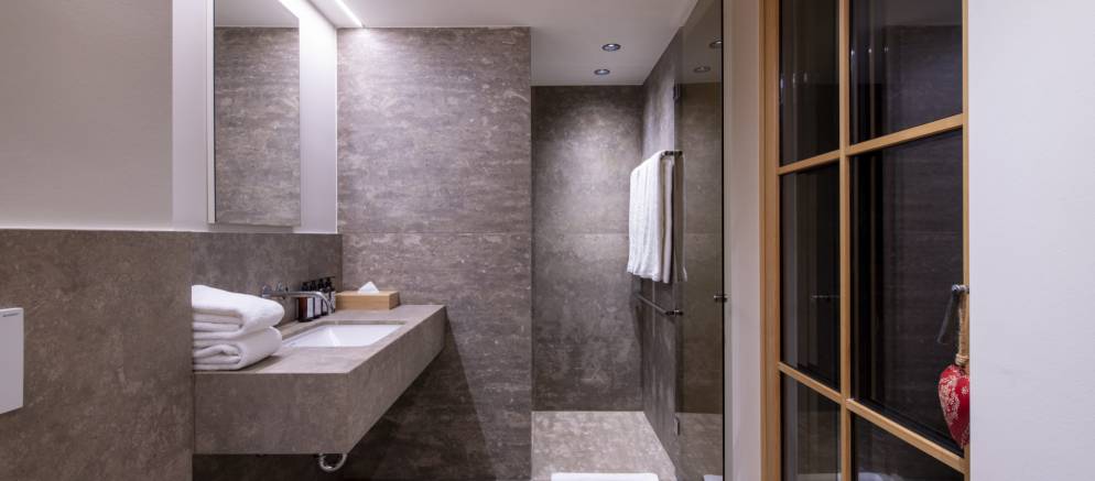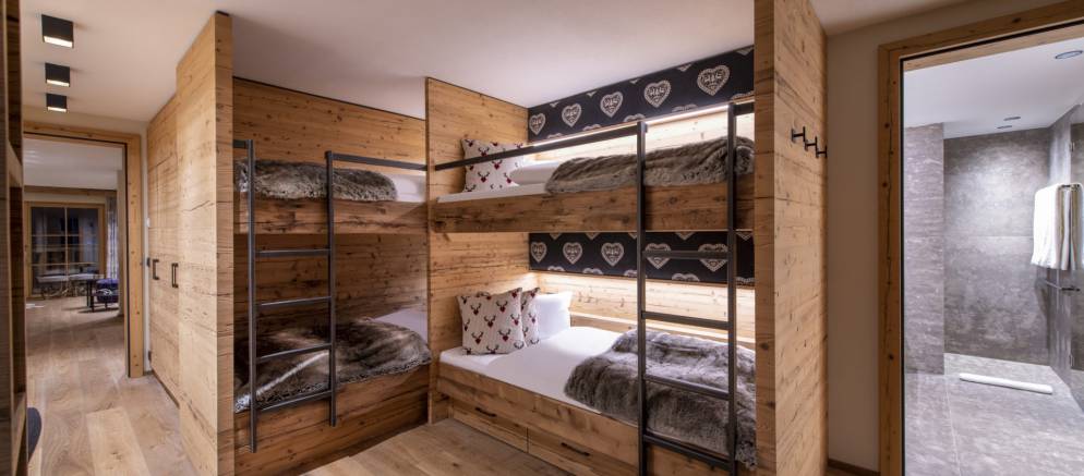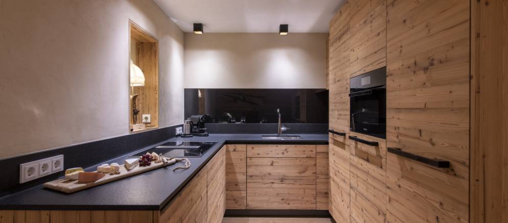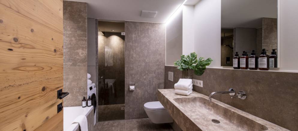 Brunnenhof 9 is located on the second floor of the property and sleeps 6-8 guests in three bedrooms. Offering 98m2 of living space, this well-designed apartment has an open plan kitchen, living and dining area, perfect for entertaining with family and friends. This space is full of wood panelling, elegant grey fabrics and contemporary light fittings that all help to create a modern Alpine home.