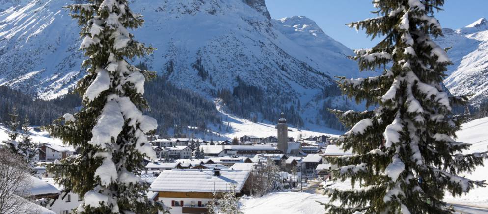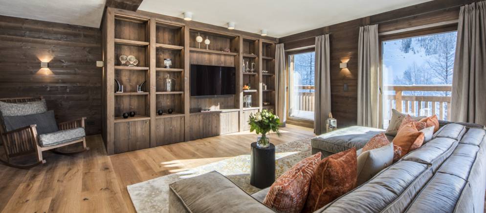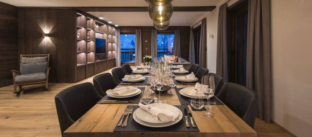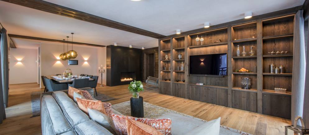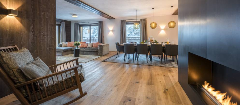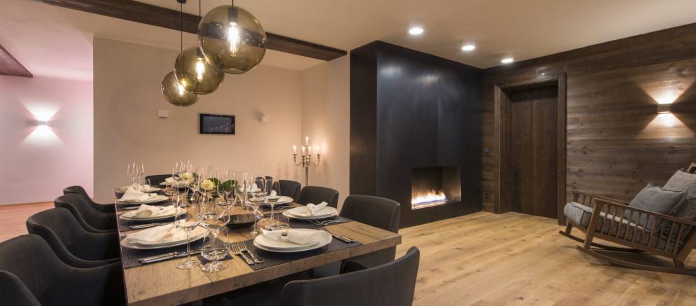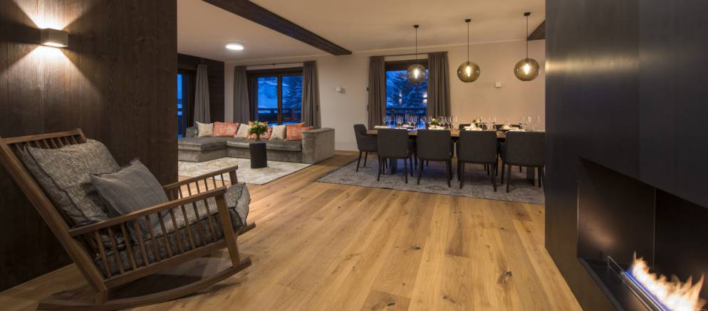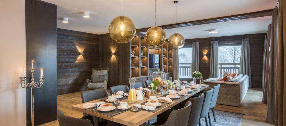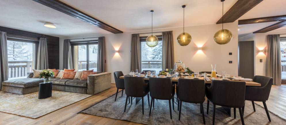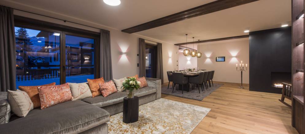 A large comfortable sofa and chic dining table are bathed in light from the floor to ceiling windows affording gorgeous views over Lech and the breathtaking mountain scenery.