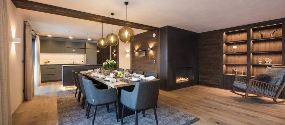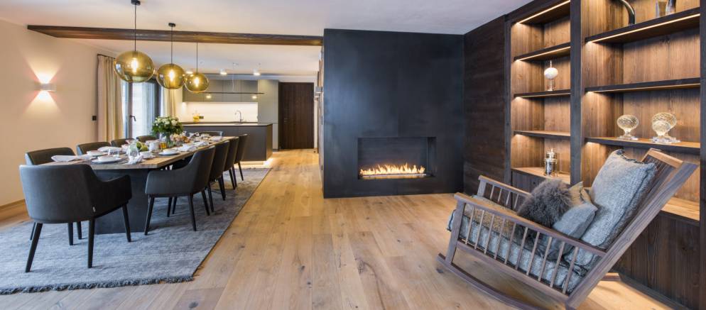 At the heart of the apartment you will find the open plan living and dining area. The fantastic dining area easily sits everyone. The other half of the space is filled with large inviting sofas, wonderful for relaxing and curling up by the modern fireplace.