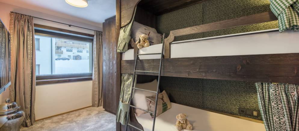 Moving through the generous hallway to the other side of the apartment is a further bedroom, which can also be made up as a twin or double. It boasts access to the large south facing terrace that catches the sun and is the perfect place for a morning coffee overlooking the mountains. It shares a private shower room with the delightful children`s bunk room.