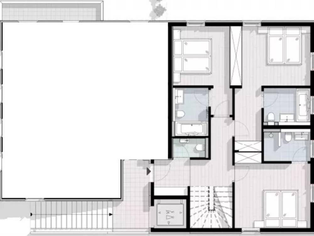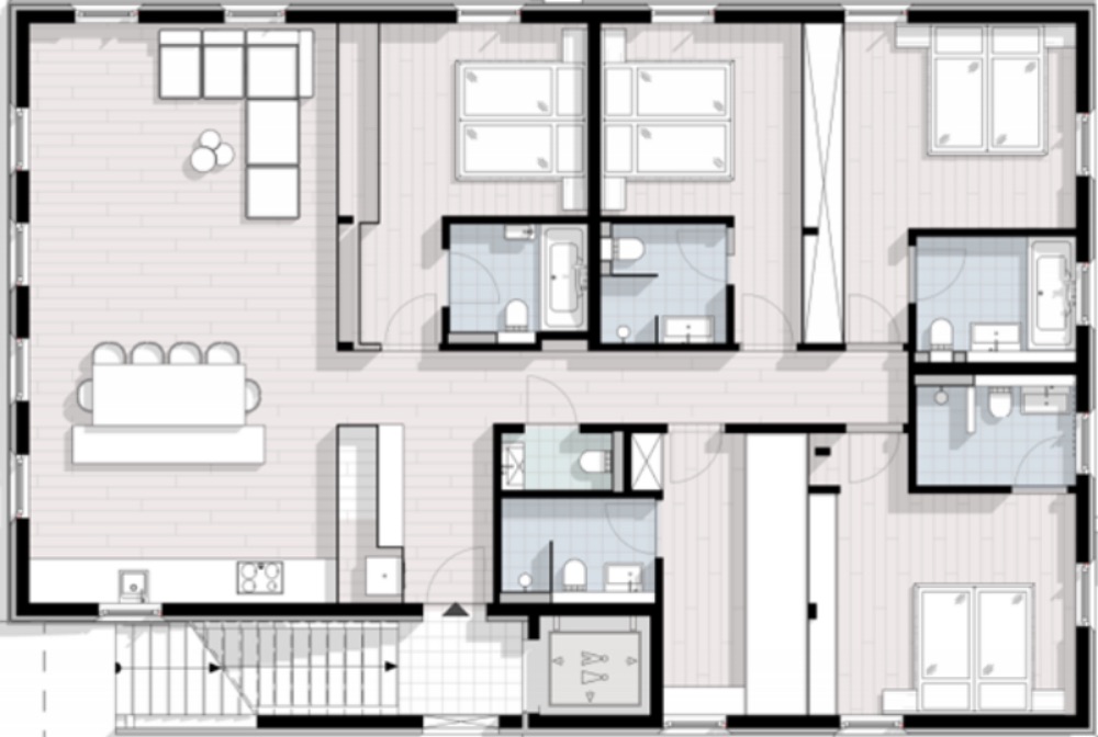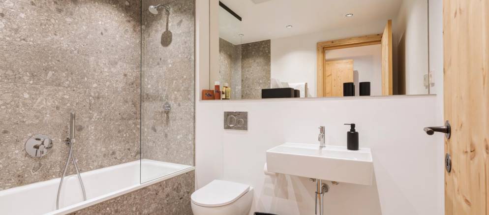 Apartment 1 is arranged across the entire ground floor and can accommodate 10-12 people in five en-suite bedrooms. Apartment 2 and Apartment 3 are duplex properties arranged across the top two floors of the chalet and can both accommodate 8 people in four en-suite bedrooms. Each apartment features an open plan living space with lounge area, dining table and kitchen, as well as a washing machine.