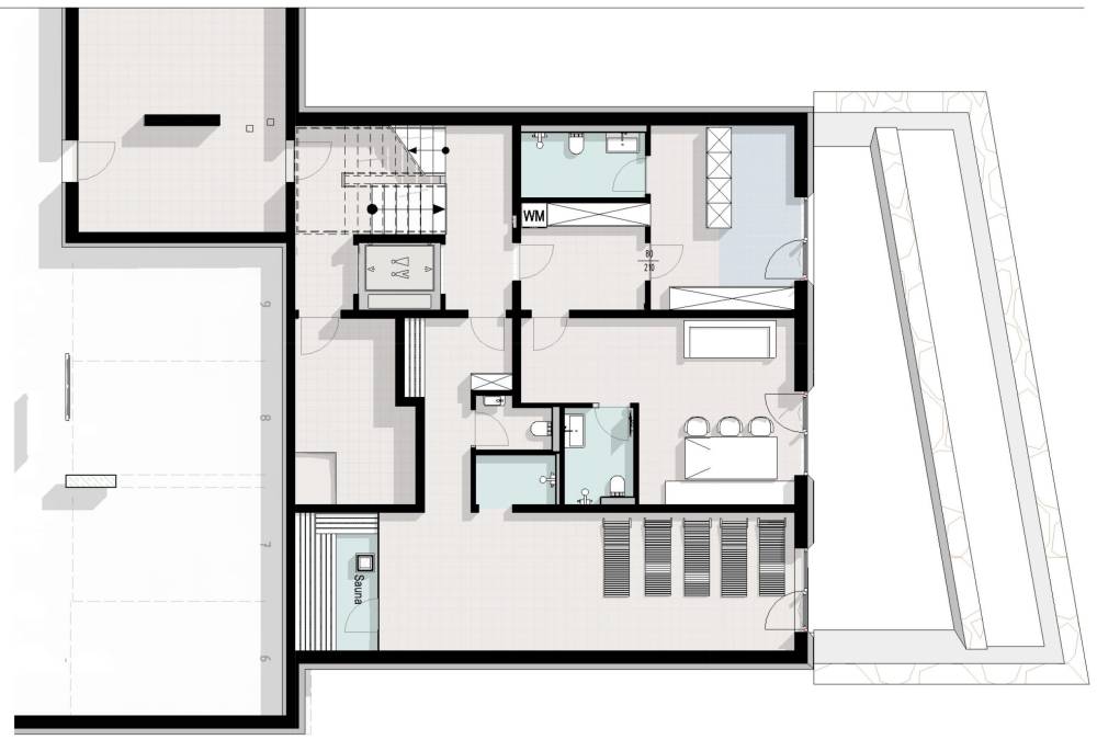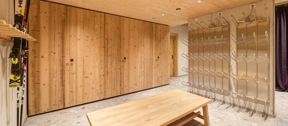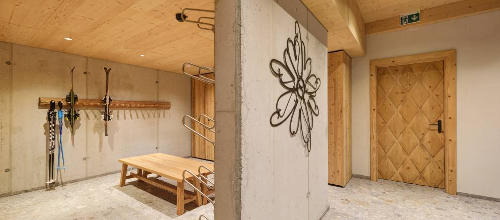 In the basement of the chalet there is garage car parking available for those driving to resort, as well as a shared wellness area with sauna and relaxation area, plus a ski room. There is also an elevator which provides access from the basement level to all three apartments.