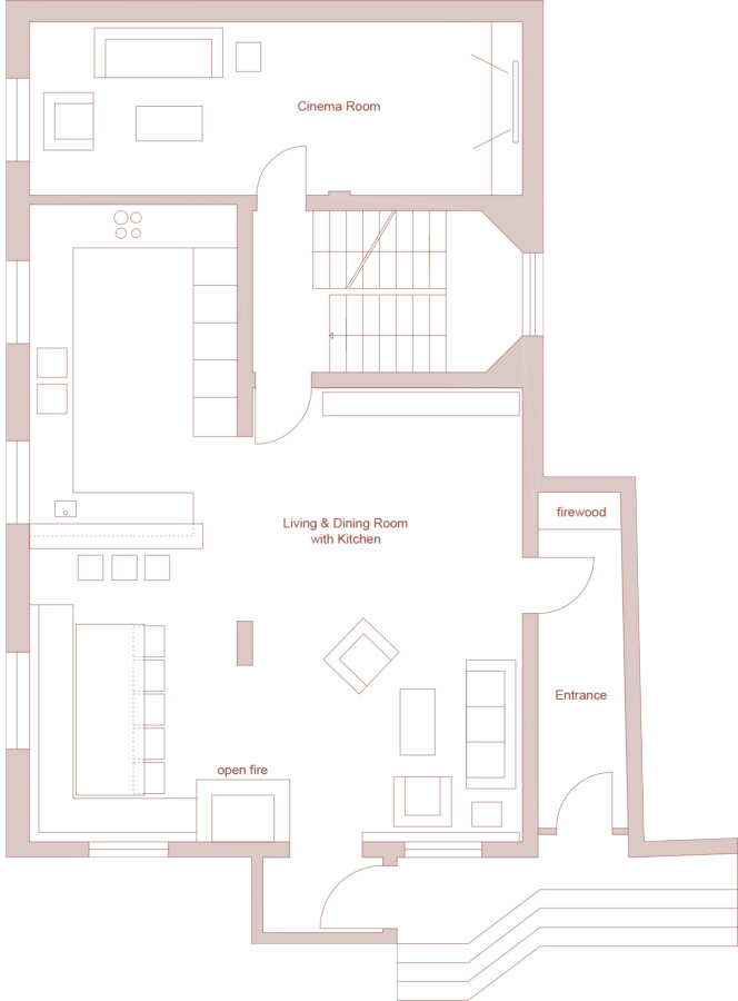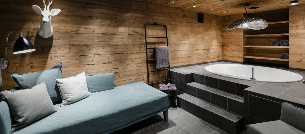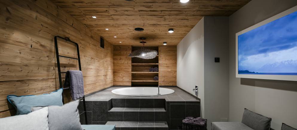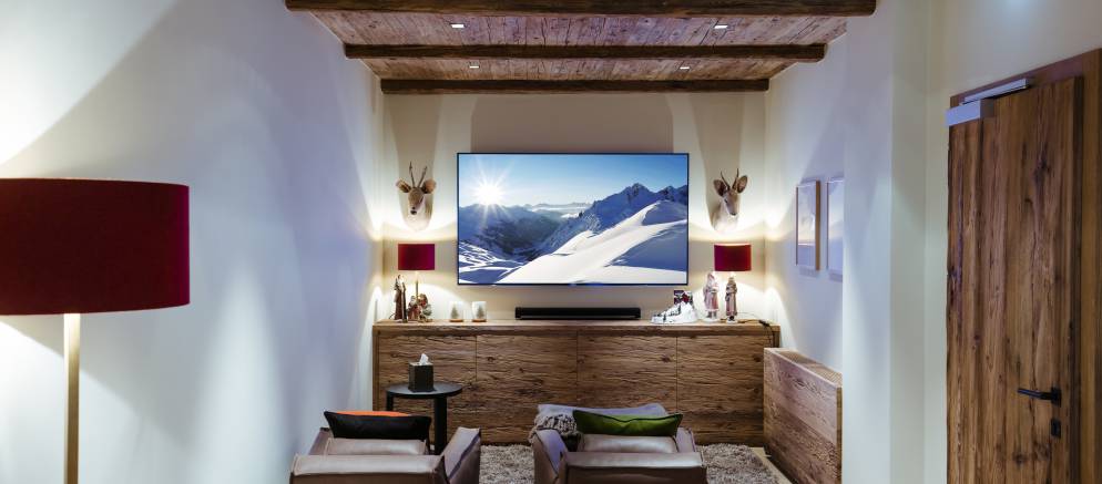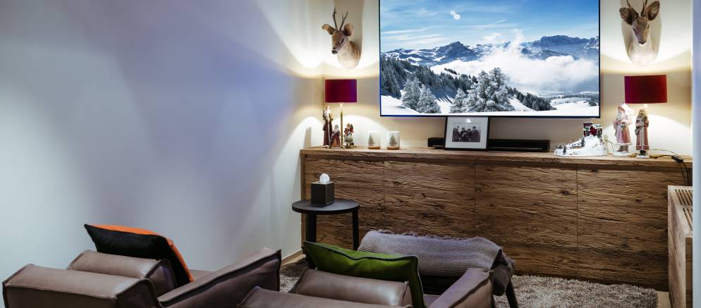 The main living areas are cosy, with an open plan living and dining room the perfect place to relax with a glass of champagne. For those after some pampering and rejuvenation, you can head down to the spa on the lower ground floor, with sauna and Jacuzzi bath where you can ease away the day. On snowy days, or when the children or parents would like their own space, there is the cinema and play room, the perfect spot with a family movie.