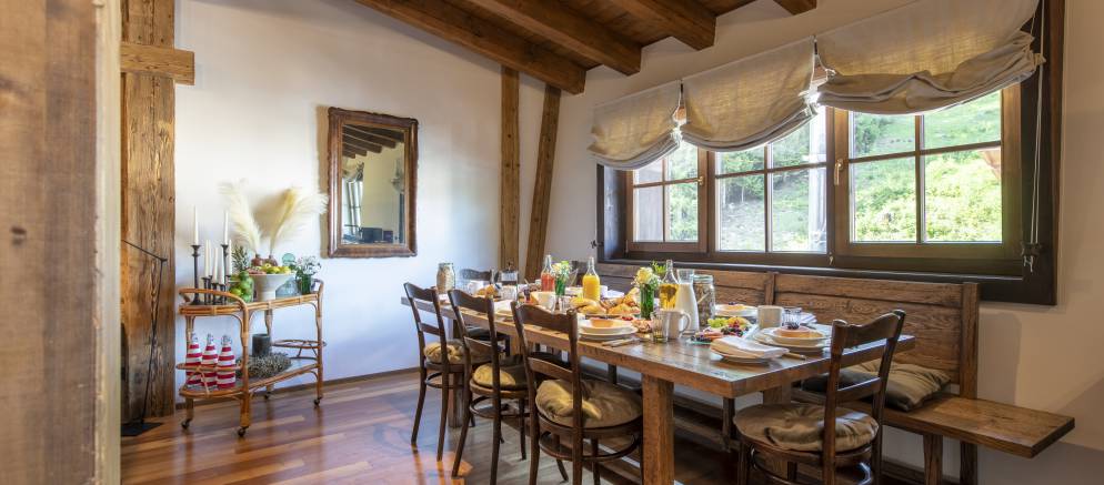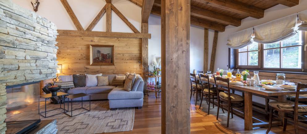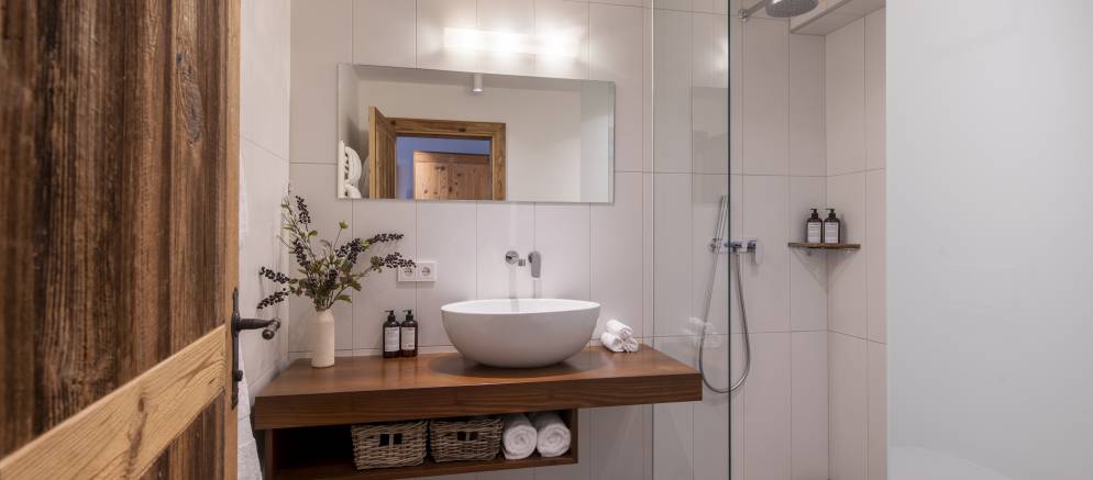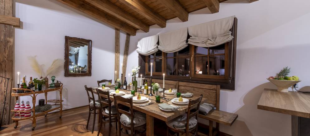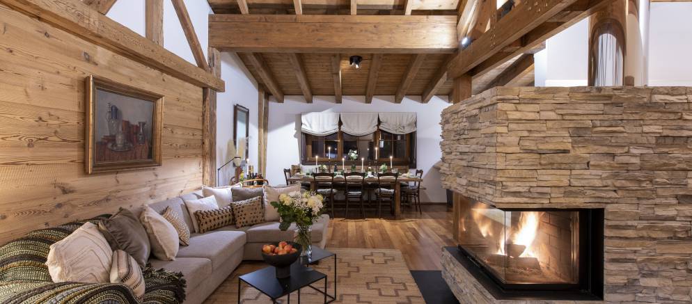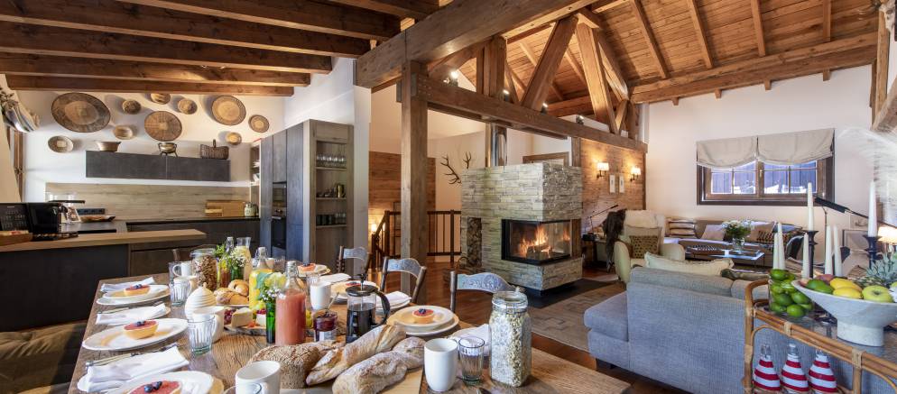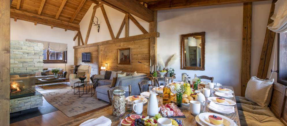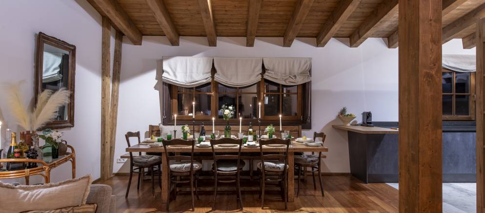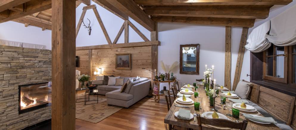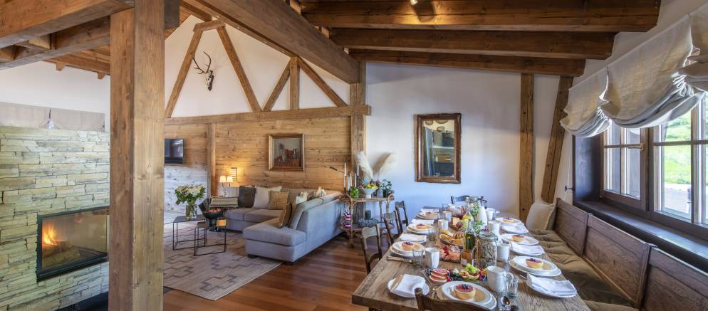 Heading up to the top floor you arrive at the wonderful open plan living rooms set beneath the vaulted timber ceiling. The centre fireplace splits the room in two, with the sitting room with plentiful seating on one side, and the dining room on the other with views across to the Rendl ski area. The dining table seats ten and the modern open kitchen is adjacent and perfect for cooking up meals during your self-catered holiday.