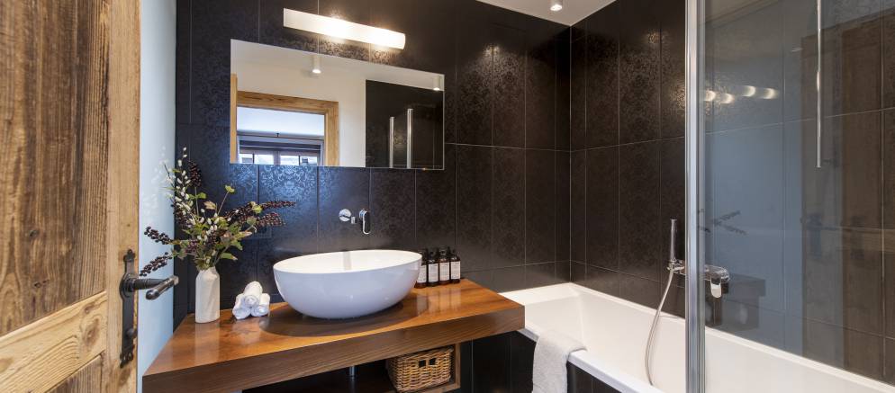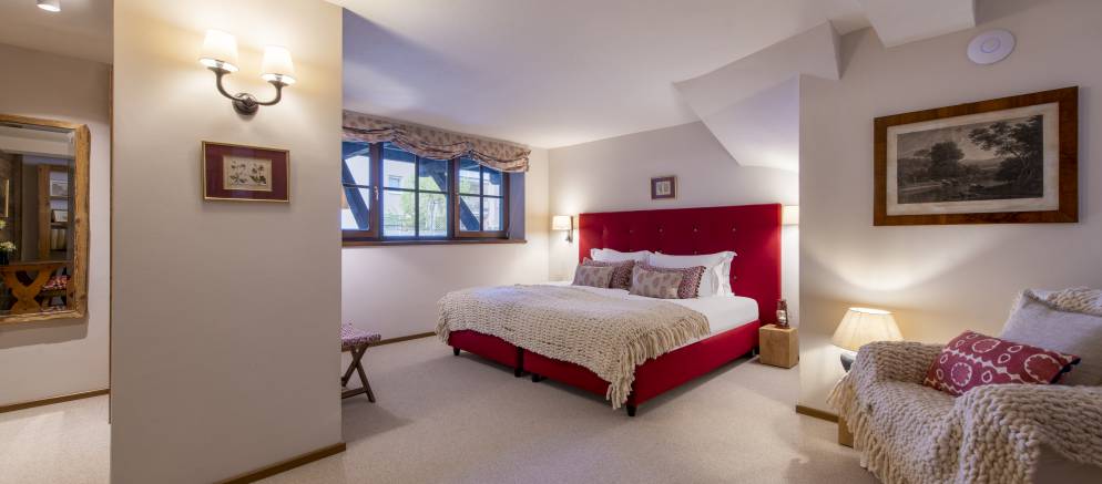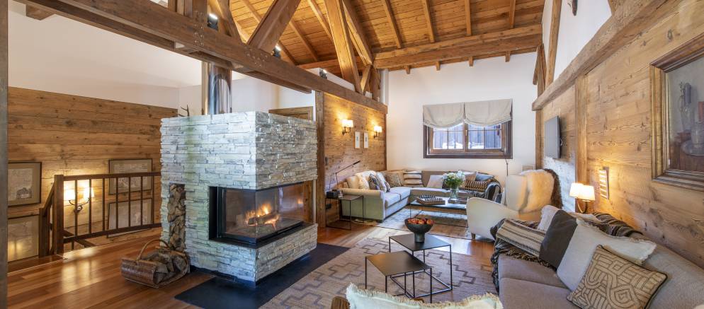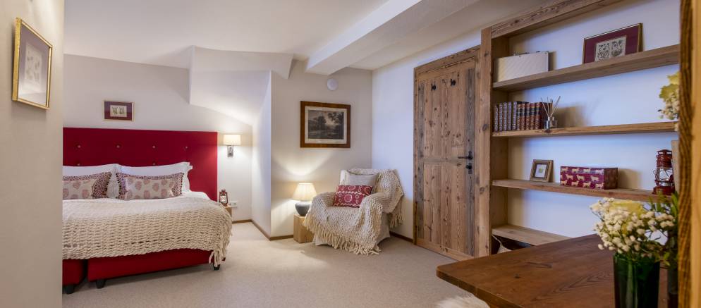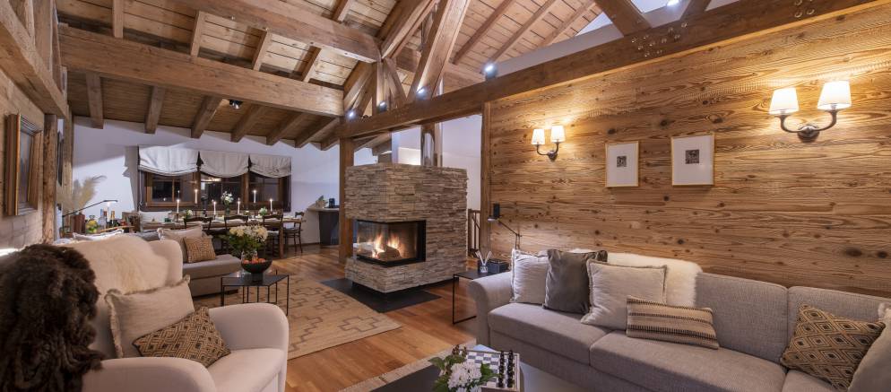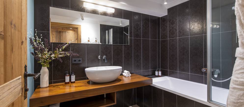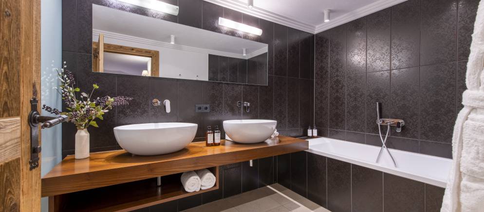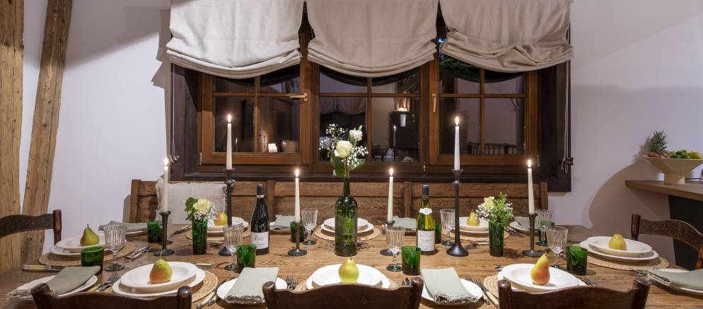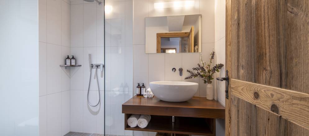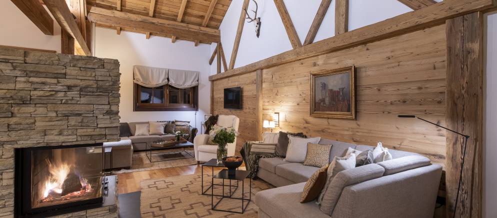 Heading up to the top floor you arrive at the wonderful open plan living rooms set beneath the vaulted timber ceiling. The centre fireplace splits the room in two, with the sitting room with plentiful seating on one side, and the dining room on the other with views across to the Rendl ski area. The dining table seats ten and the modern open kitchen is adjacent and perfect for cooking up meals during your self-catered holiday.