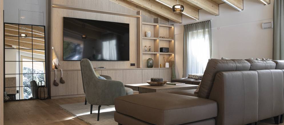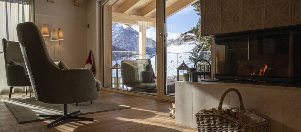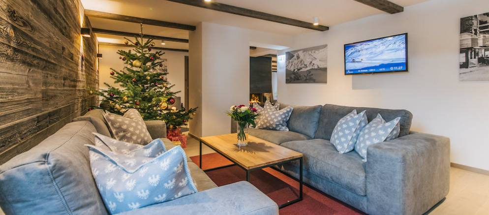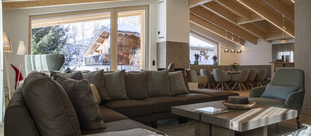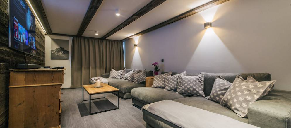 Children can enjoy an array of games and toys in the living room and this space also opens out to a large balcony terrace with outdoor seating, or after fresh snow they can head outside and build a snowman in the private gardens surrounding the sauna and relaxing area.