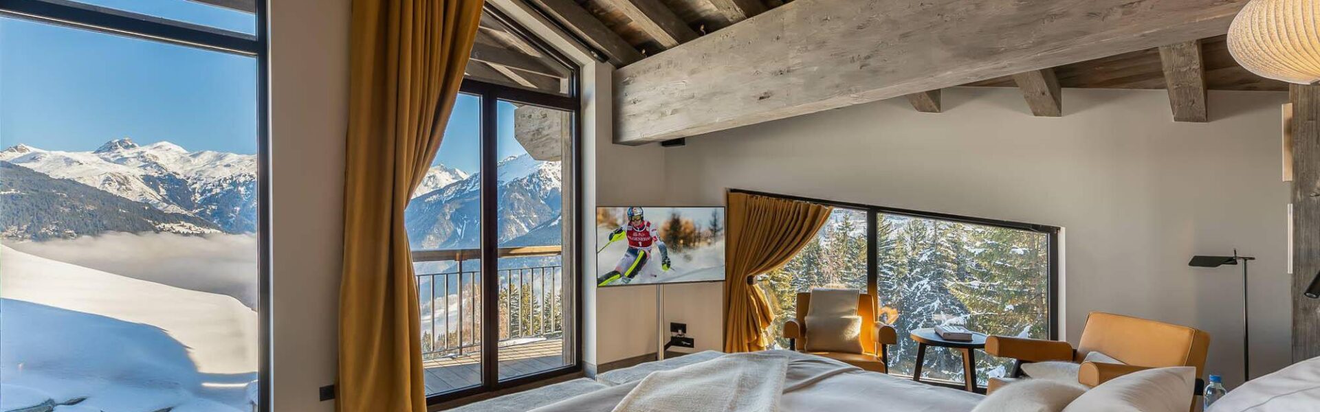 After a comfortable night’s sleep in the king-sized bed and with the press of a button, the curtains pulled back to reveal the sun-drenched mountains. The master suite offers an intimate connection with both the opulence of the chalet and the majesty of the surrounding natural world.