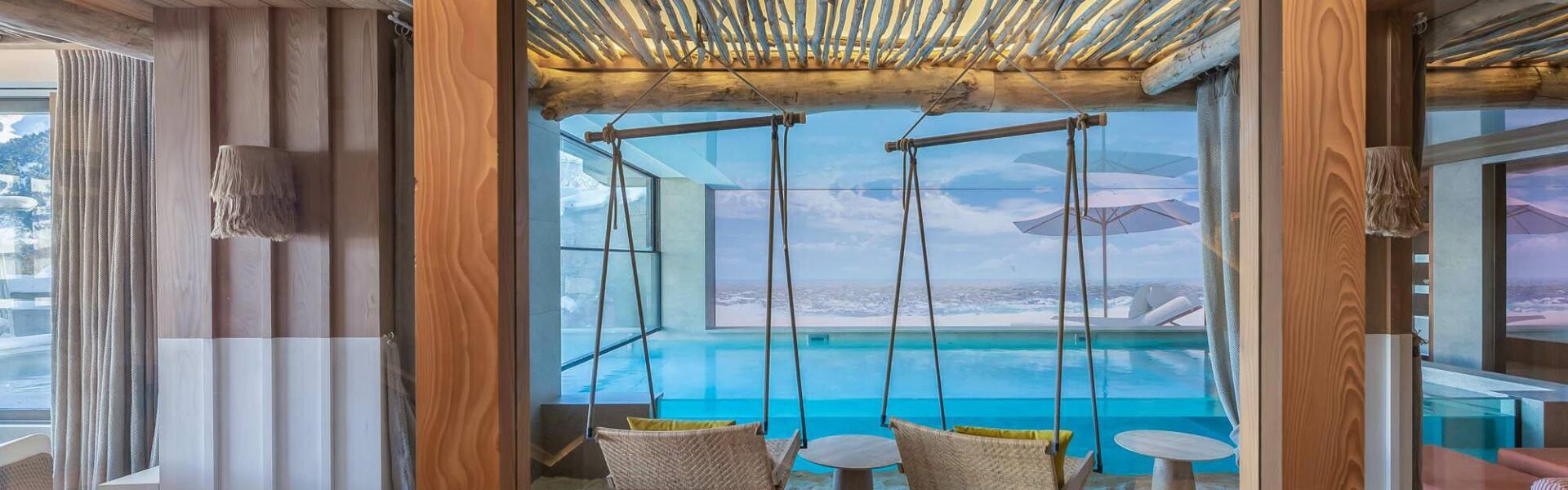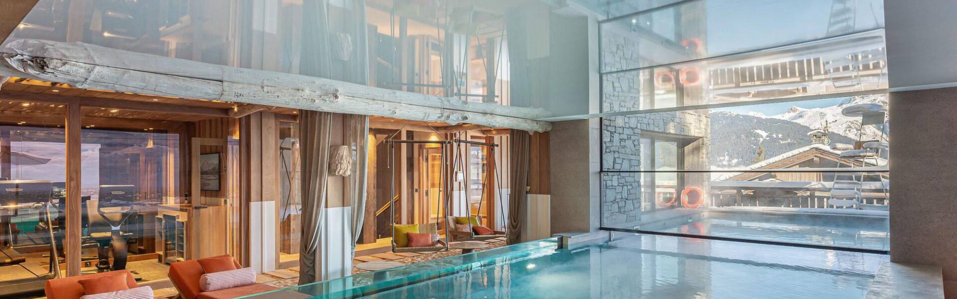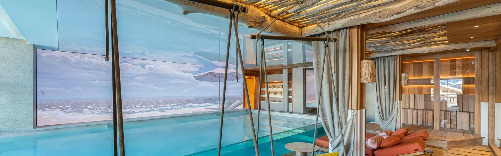 The indoor pool also has a snazzy feature that lets you swim outside in the fresh mountain air. At the touch of a button a glass screen rises at one end of the pool, creating a mesmerizing half-indoor, half-outdoor pool experience, while a large screen displays scenes of the iconic St. Tropez beach or beach sunsets, making it a truly immersive environment.