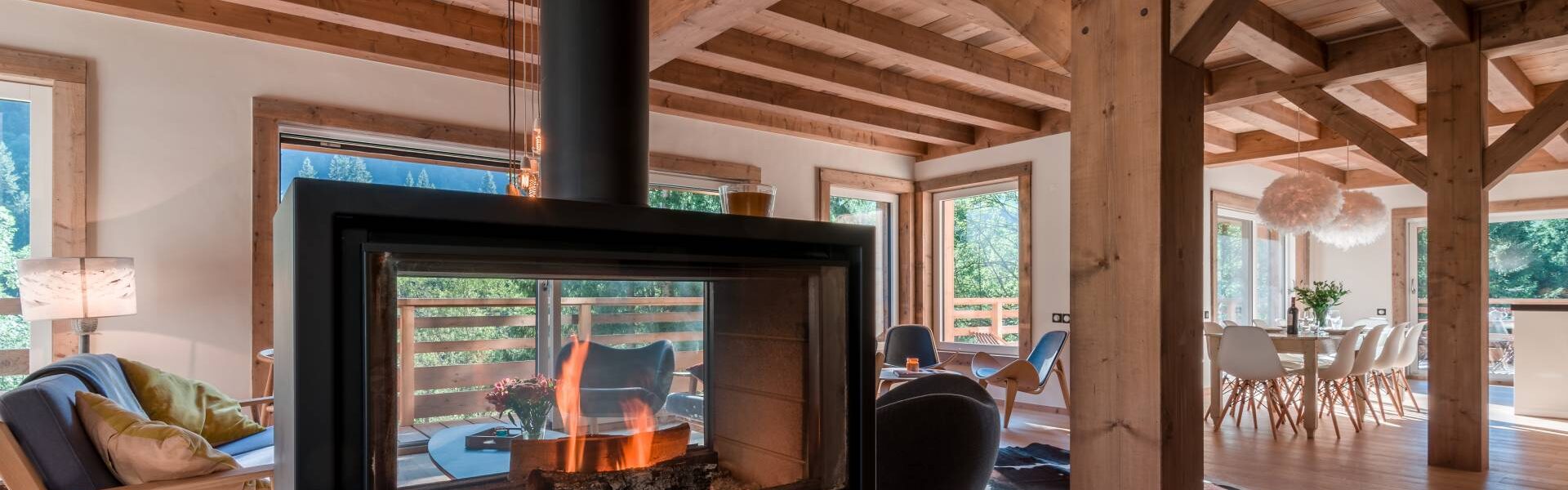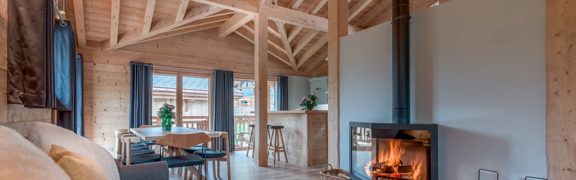 The main living area of the chalet is contemporary in design, airy and spacious with full height windows flooding the room with natural light. Outside wrap around balconies providing panoramic views. It’s easy to imagine settling down here to afternoon tea in front of the fire with a hot chocolate after a full days skiing.