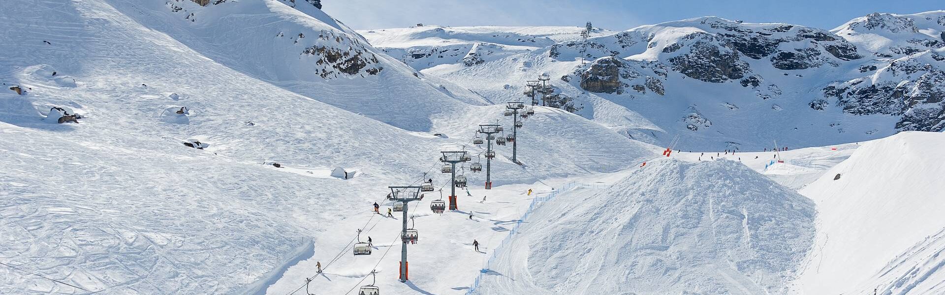 After a delicious lunch itâs back to the slopes to head up onto the glacier, where the snow is still perfect in the afternoon. From outside the restaurant, we can take the Grande Motte cable car to arrive at the top of the glacier at a heady height of 3,456m. For the brave, we can ski our first black mogul run of the day, or if you want to get things moving more gently after lunch, the red âGlacierâ piste will bring you back to the bottom of the cable car.