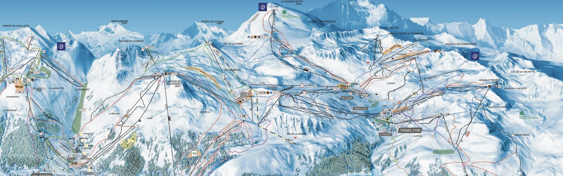 As we are all looking forward to a long lunch, lets burn off a few more calories to make our menu choices guilt free. We are now ready for a more challenging red run, but first letâs carve down the Rhododendron piste again, so we can then take the brand-new Marais chairlift. New for winter 2024/25, the chairlift gives us a great view of the Eye of the Needle rock, a famous local landmark! We can now ski down the sweeping Cyclamen red run, followed by the blue run AnĂ©mone, before continuing onto the blue Gentiane slope back into Tignes Le Lac.