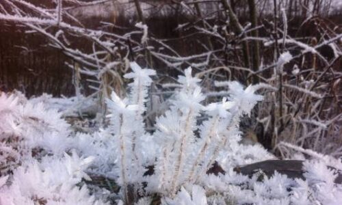 The interlocking ice crystals become attached to branches of trees, leaves, hedgerows and grass blades and are one of the most prominent features of a typical ‘winter wonderland’ day. However, the fine ‘feathers’, ‘needles’ and ‘spines’ might also be found on any other object that is exposed to supersaturated air below freezing temperature.