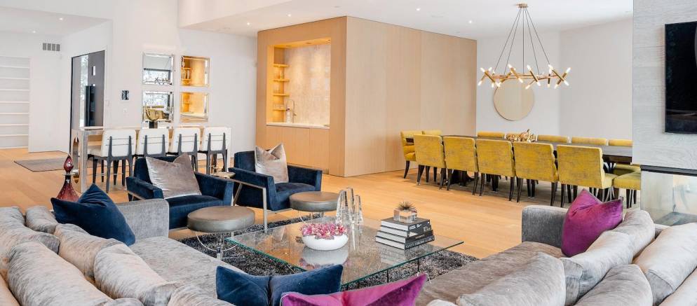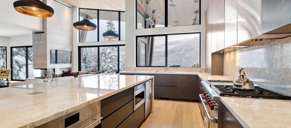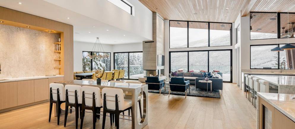 The contemporary interior is beautifully finished, and the grandeur of the estate’s great room, dining and kitchen areas is inescapable. The open plan living rooms with vaulted ceilings enjoys plenty of bright, natural light and outstanding panoramic views. The large and open chef’s kitchen is fully equipped and offers plenty of worktop space as well as a separate prep kitchen.