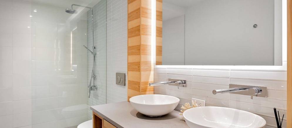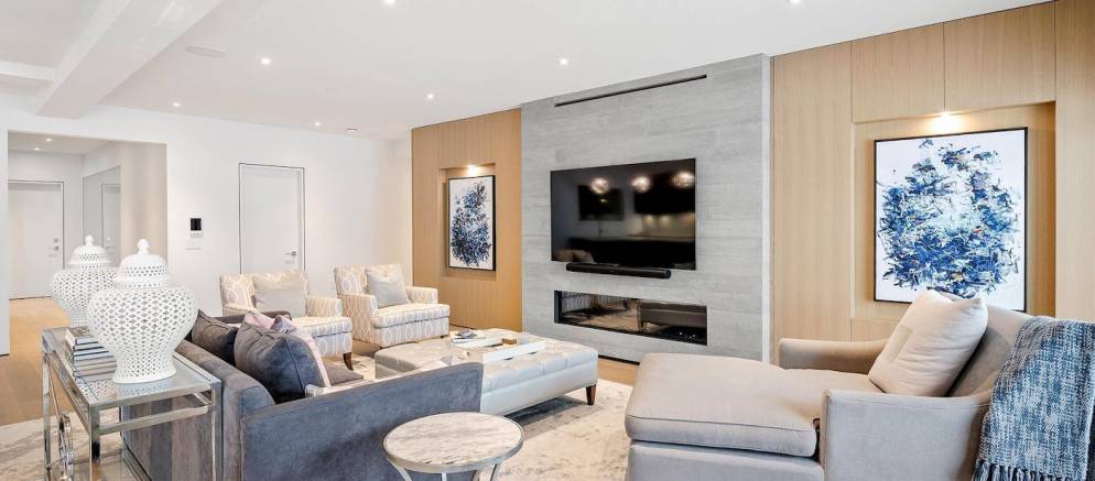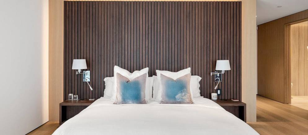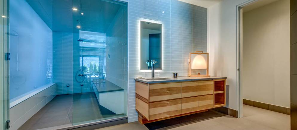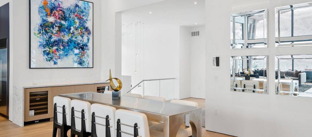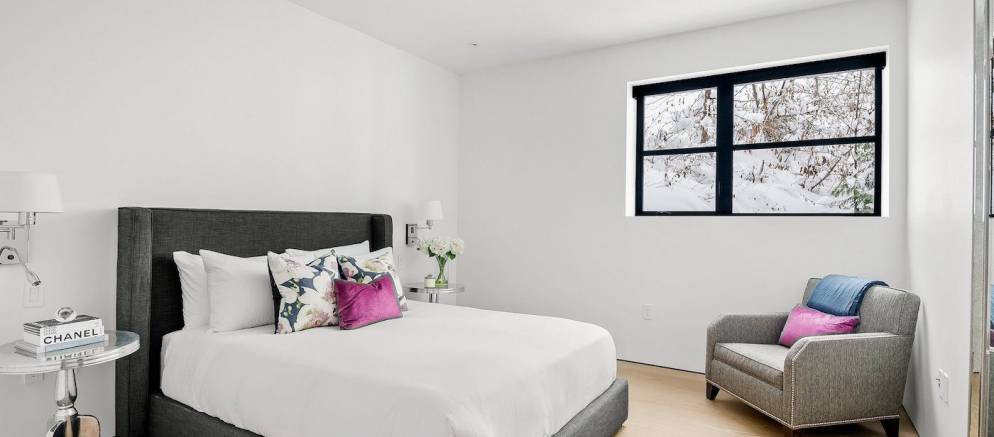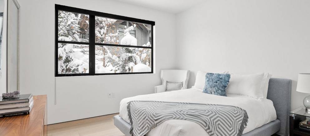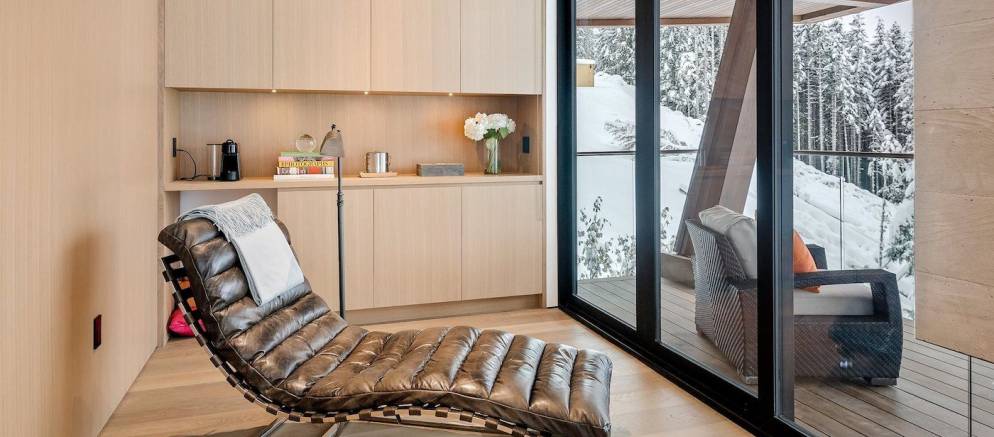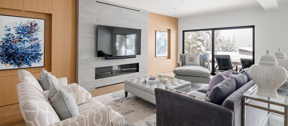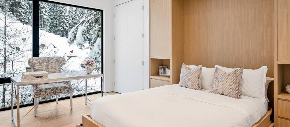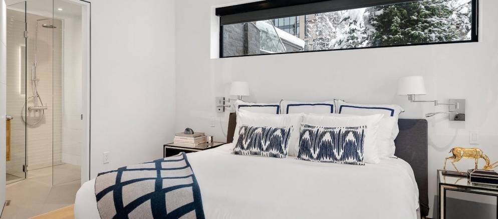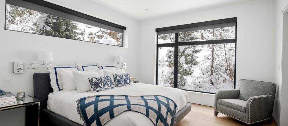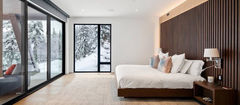 All six/seven bedrooms have been designed with clean lines and minimalist décor. This stunning home is a fabulous place to entertain your group after a day out on the ski slopes. The extensive facilities include a large outdoor hot tub, multiple fire pits and gas fireplaces, large patios on all three levels, as well as a ping pong table, wet bar, two 90-inch TVs, gym, and hammam-style steam room.
