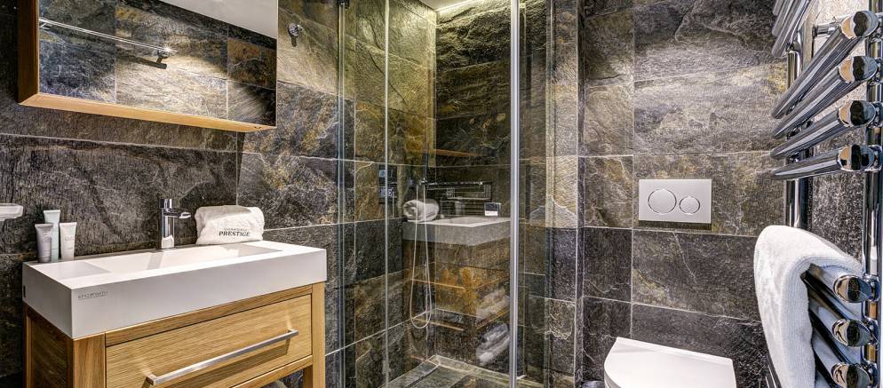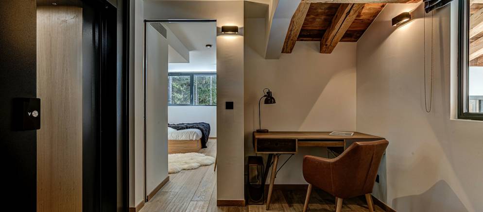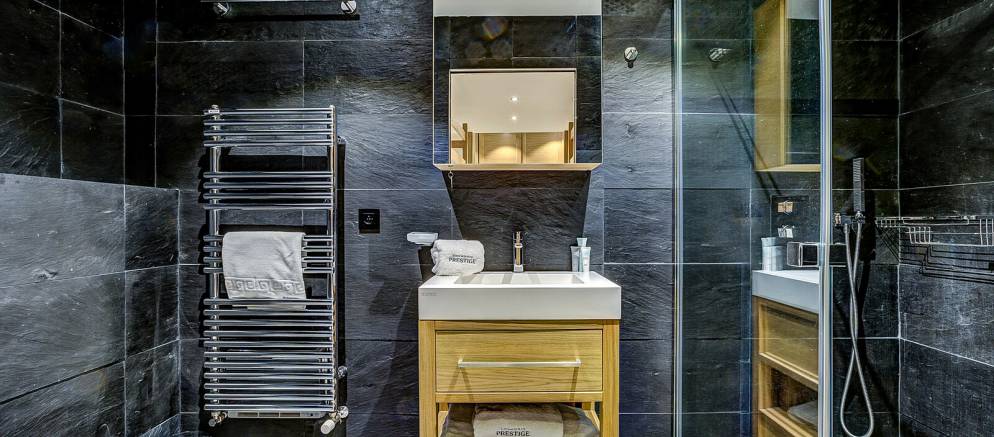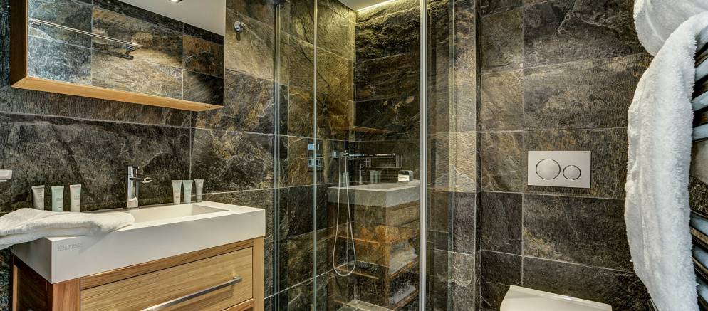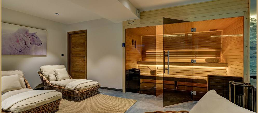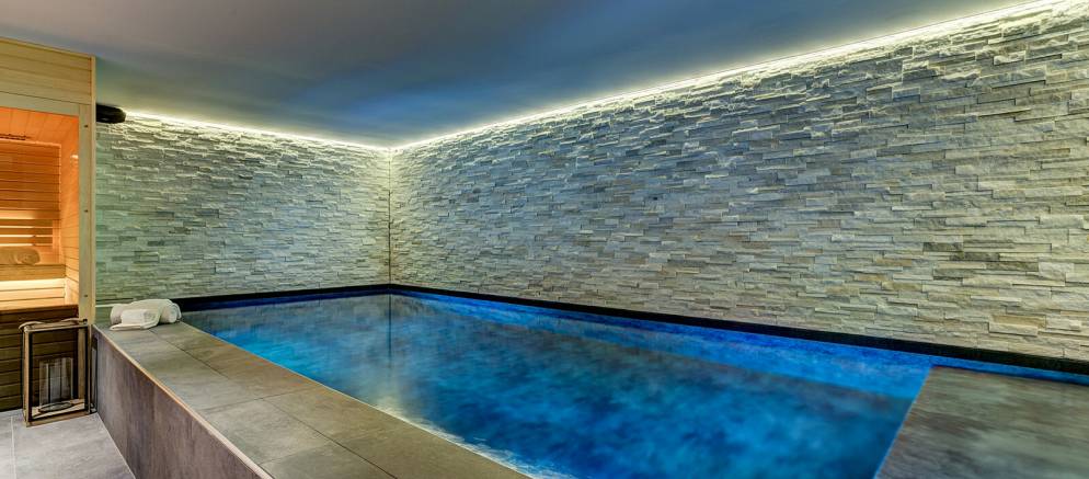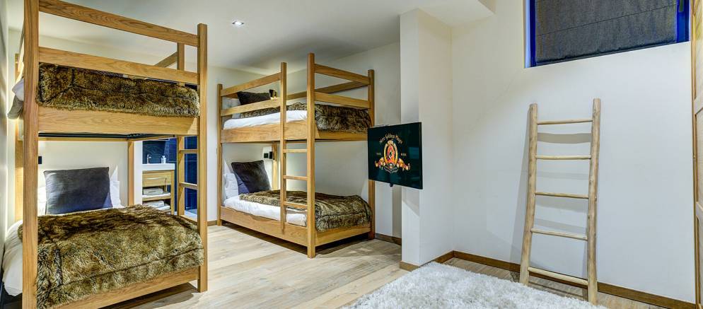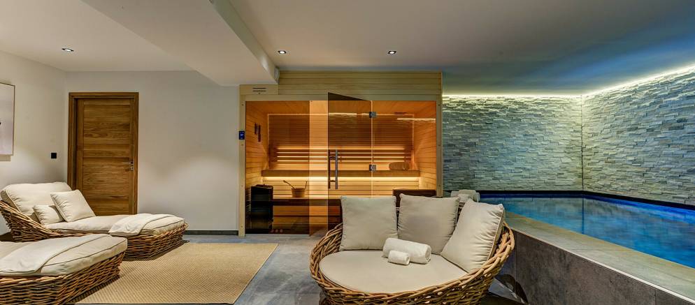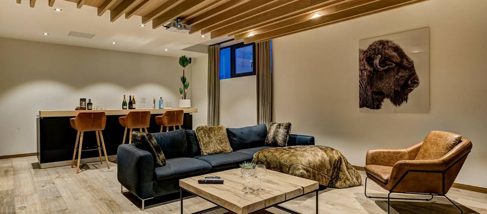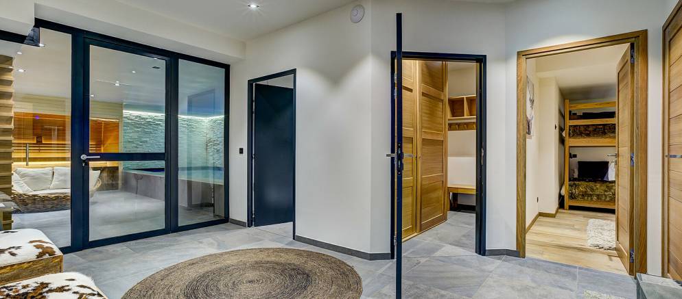 On the lower ground floor of the chalet is the fifth and final bedroom which features two bunk beds and has an en-suite shower room and toilet. Also on this level are the spa and entertainment facilities, with a wellness area with indoor heated resistance swimming pool, sauna and relaxation area. A large cinema room with bar is the perfect bolt hole for fun nights in with friends, or a relaxed movie night with the kids.