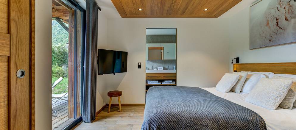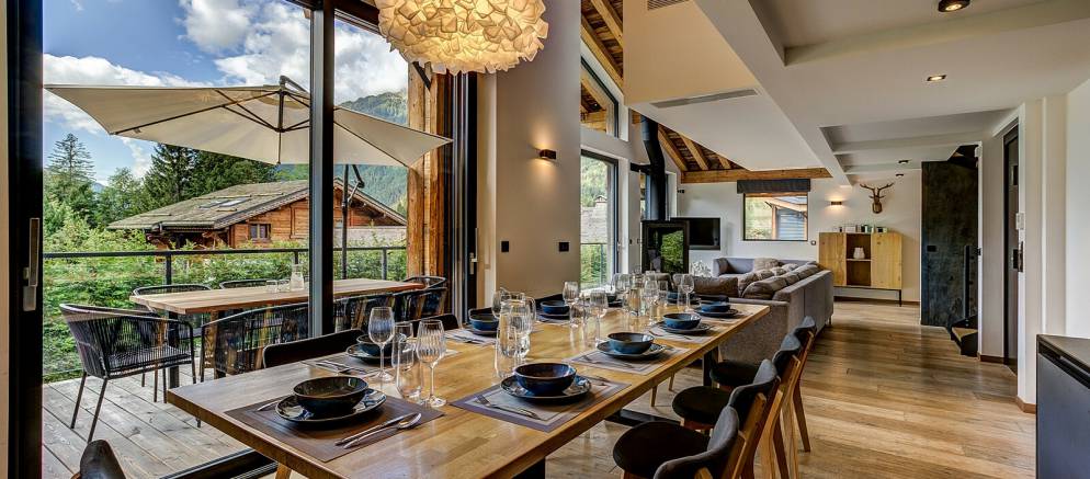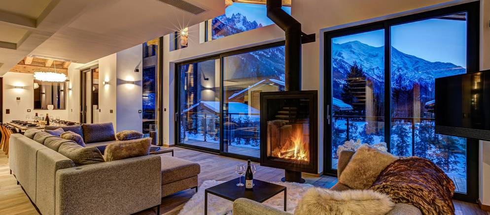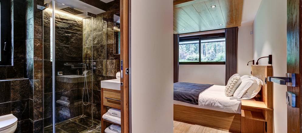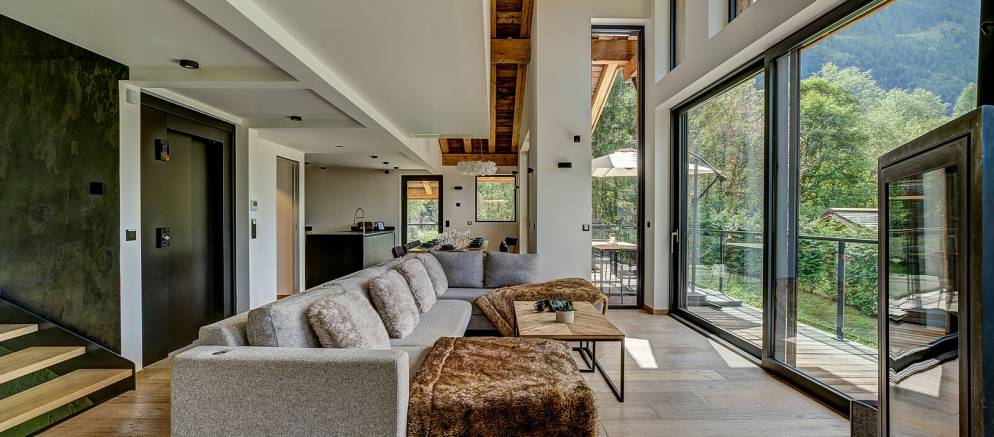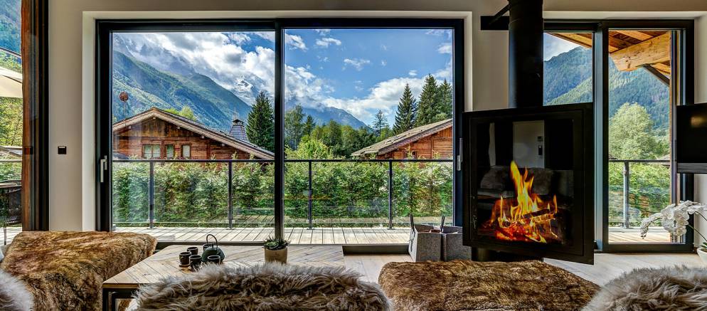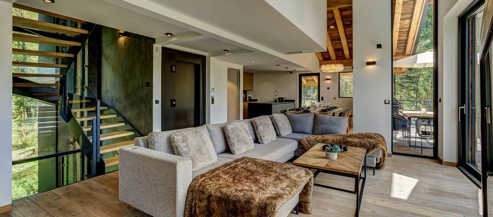 The chalet is spread over four floors and 364m2 of floor area. The open plan living rooms are arranged across the first floor where floor-to-ceiling windows frame the panoramic Mont Blanc views. On snowy winter nights you can curl up on the sofa with a hot chocolate next to the wood burner, or in the summer step out onto the wrap-around terrace and enjoy alfresco dining.