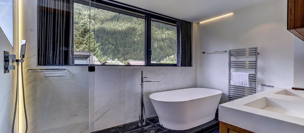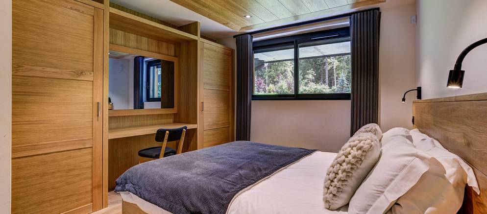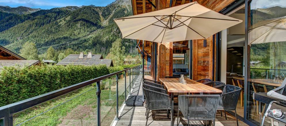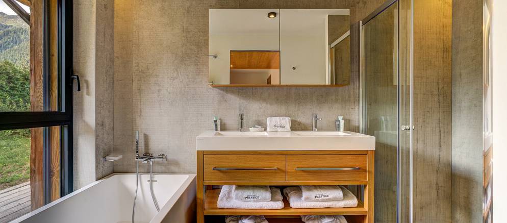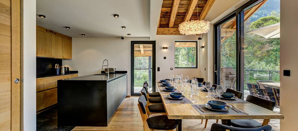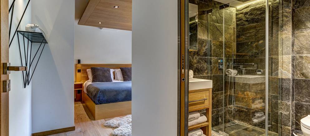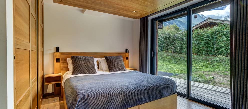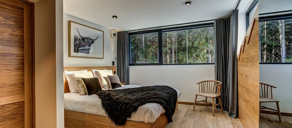 The chalet is spread over four floors and 364m2 of floor area. The open plan living rooms are arranged across the first floor where floor-to-ceiling windows frame the panoramic Mont Blanc views. On snowy winter nights you can curl up on the sofa with a hot chocolate next to the wood burner, or in the summer step out onto the wrap-around terrace and enjoy alfresco dining.