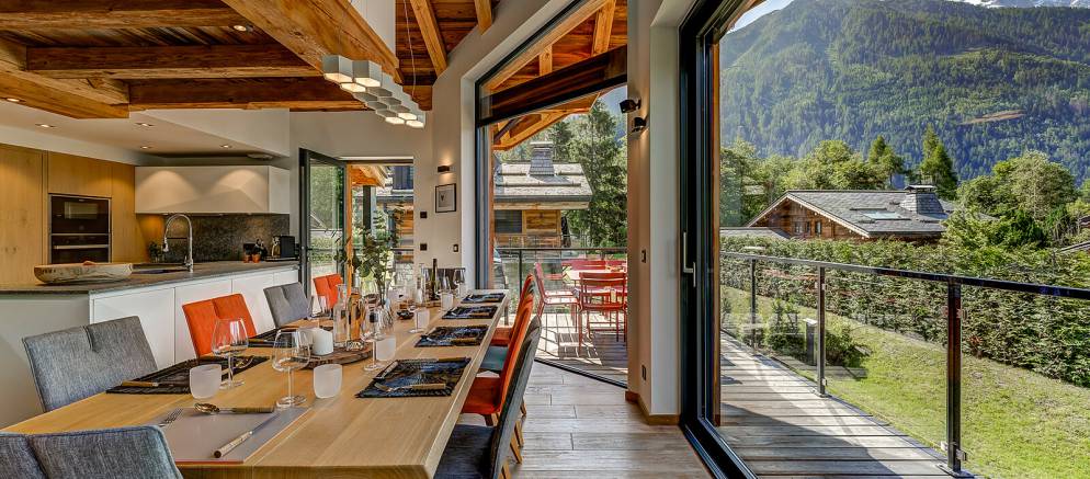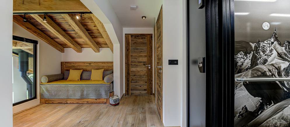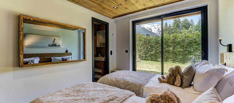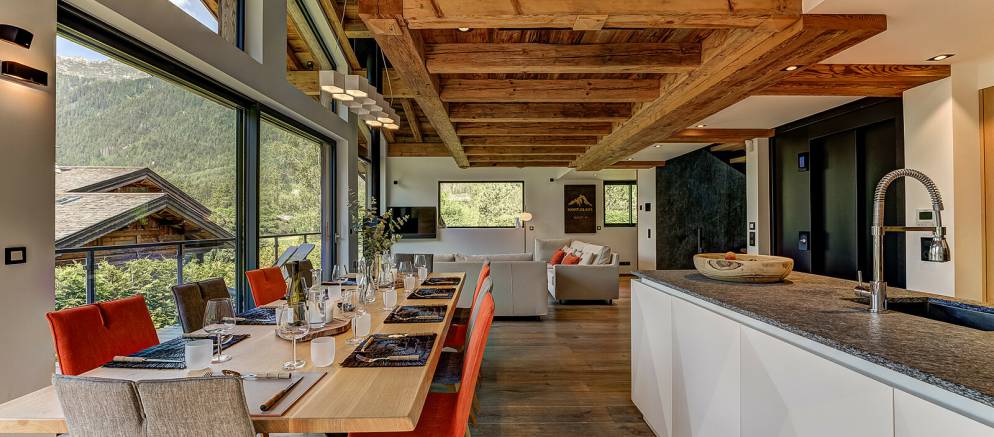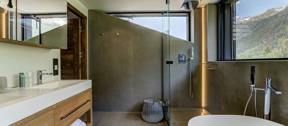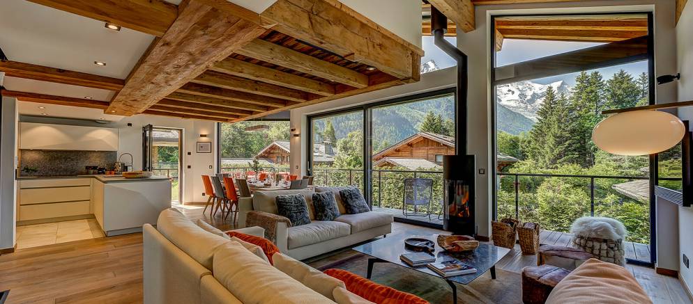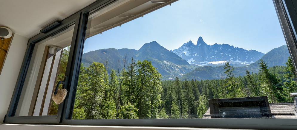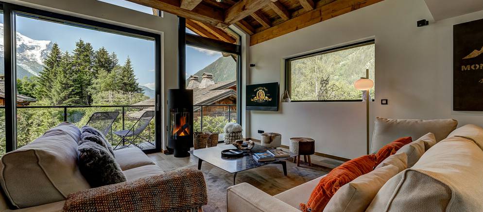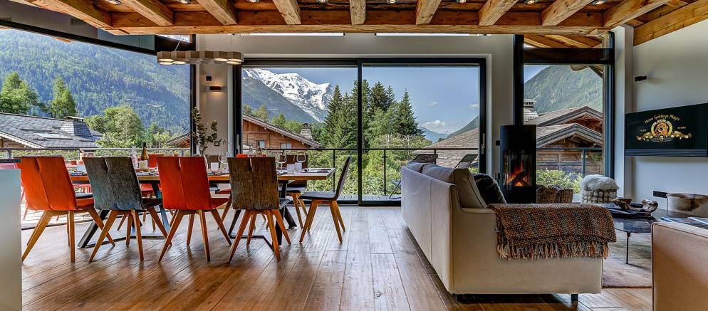 The chalet is spread over four floors and 260m2 of floor area. The open plan living rooms are arranged across the first floor where floor-to-ceiling windows frame the panoramic Mont Blanc views. On snowy winter nights you can curl up on the sofa next to the wood burner, or in the summer step out onto the wrap-around terrace and enjoy a barbecue with a mountain backdrop.