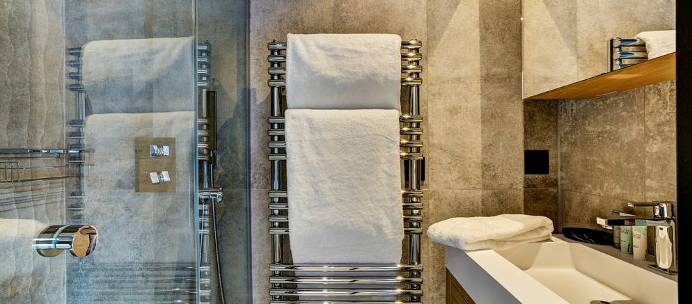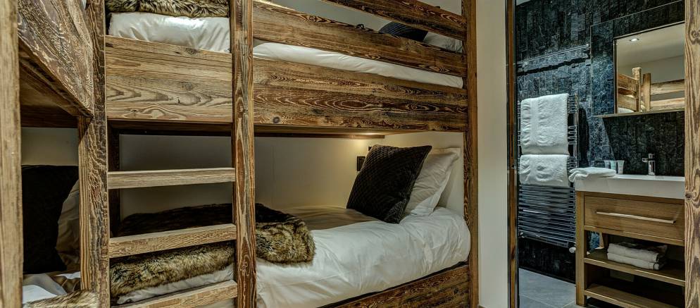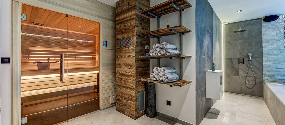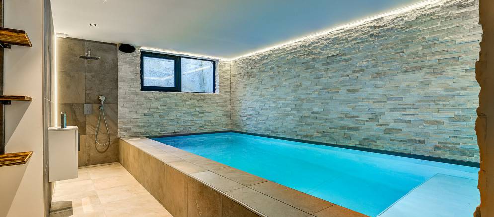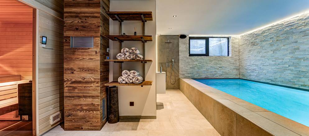 On the lower ground floor of the chalet is the fifth and final bedroom which features two bunk beds and has an en-suite shower room and toilet. Also on this level are the spa and entertainment facilities, with an indoor heated resistance swimming pool and sauna. A large cinema room with bar is the perfect bolt hole for fun nights in with friends, or a relaxed movie night with the kids.