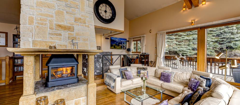 The living area has large floor to ceiling windows to capture the valley scenery. A stone open fireplace plays centrepiece to the sunken lounge and dining area to create an inviting and sociable area to relax.