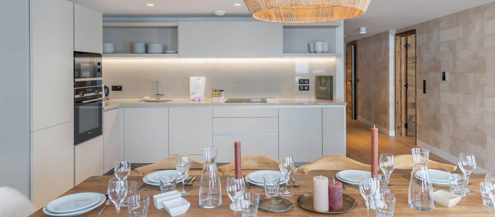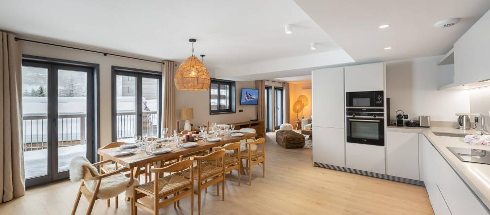 The apartment is arranged across one level, offers a very spacious 158m2 of floor space, and can accommodate up to 8 adults and 2 children. The stunning open plan living rooms are stylishly designed, features a wood burning fireplace and opens out onto a wide balcony. The kitchen is large, fully equipped and the dining table comfortably seats 10.