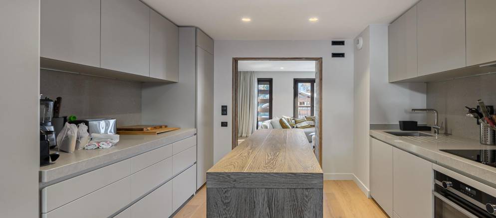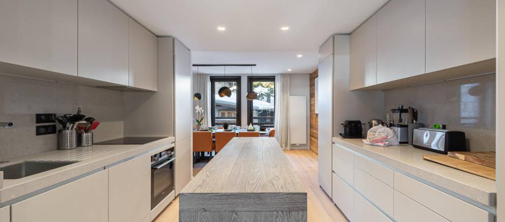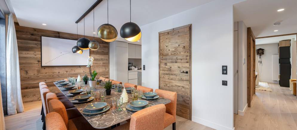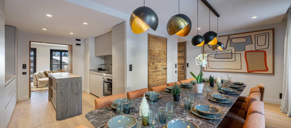 This modern apartment is arranged over three floors and 194m2 of living space. The main living areas are spread across the middle floor, with the kitchen located at the centre. To either side are the dining room with striking table and feature lighting, and to the other the living room with trendy seating, fireplace and views over the resort and mountains.