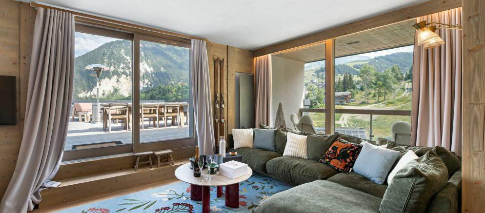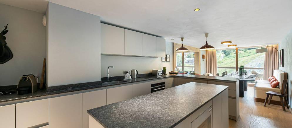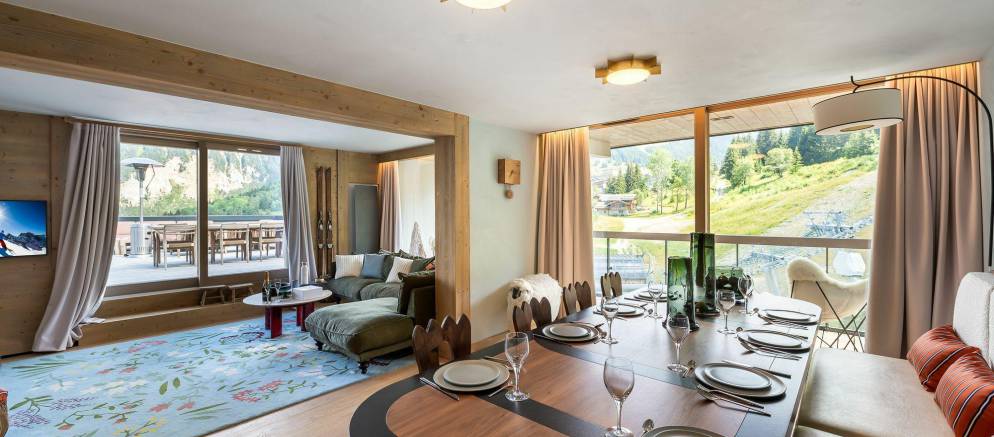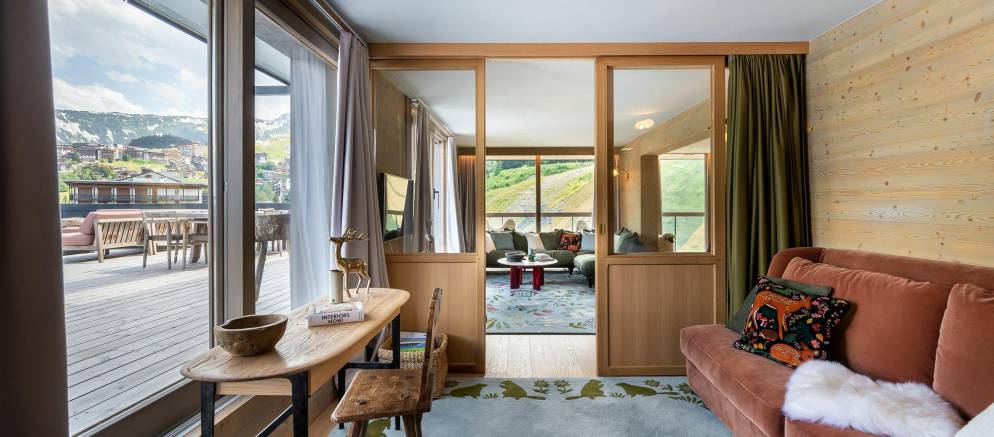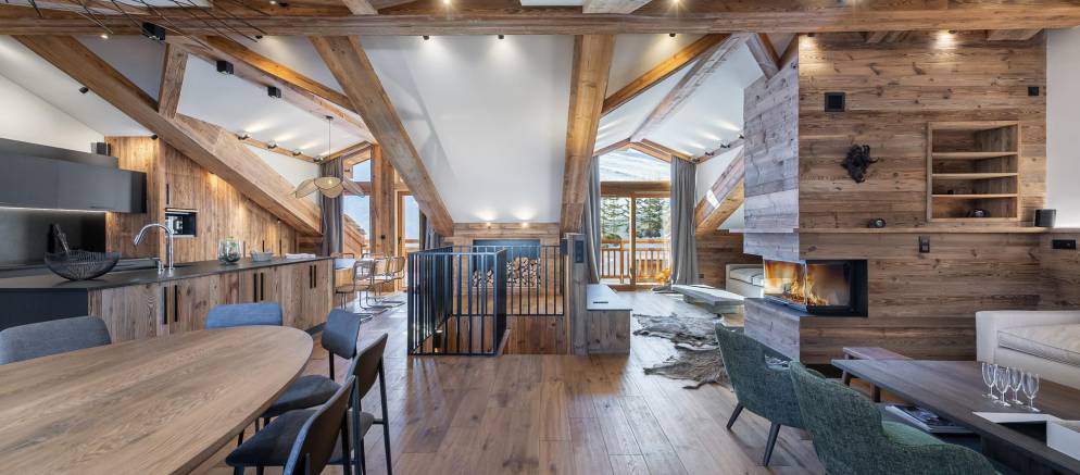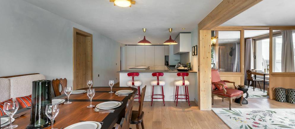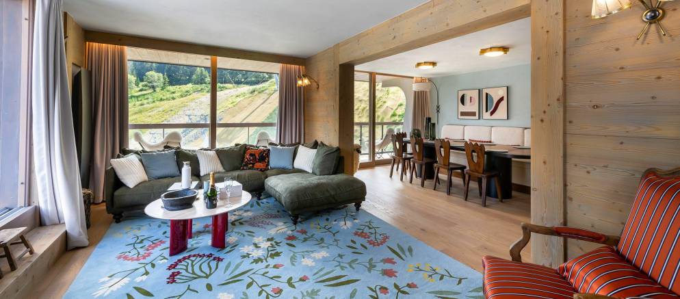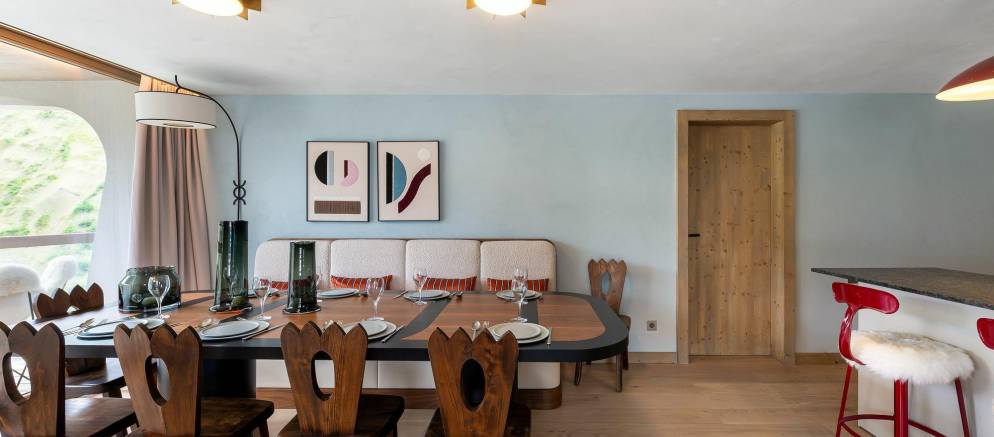 The Perchoir Blanc apartment is located on one of the upper floors and benefits from elevator access. Arranged over 185m2 of living space, the interior is spacious and full of retro style. The open plan living spaces which include a very large kitchen, are perfect for a convivial ski holiday with friends and family.