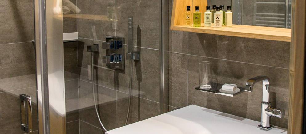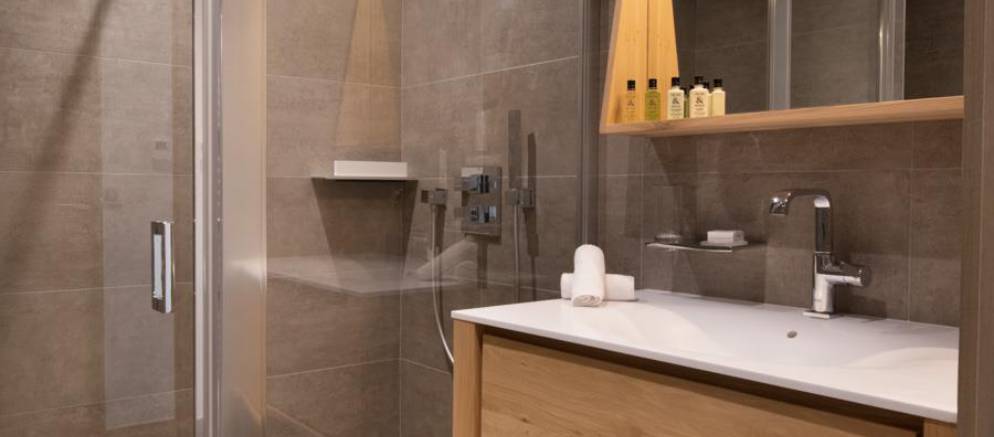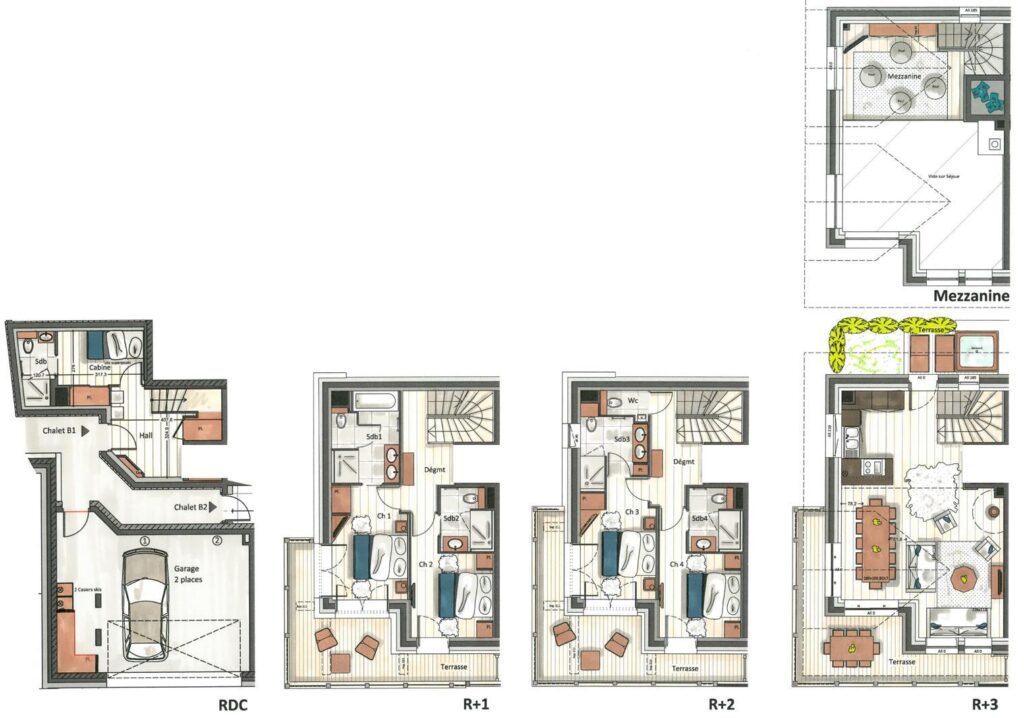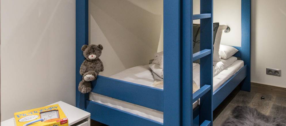 The entrance to the chalet is on the ground floor where there is also a garage with 2 car parking spaces as well as ski storage. The ground floor is completed with the first bedroom which is a children’s bunk room with en-suite shower room.