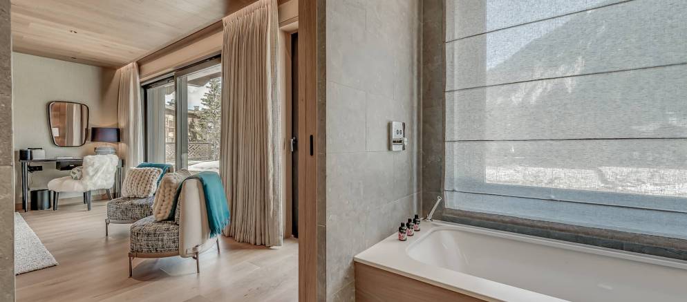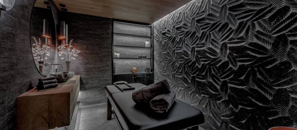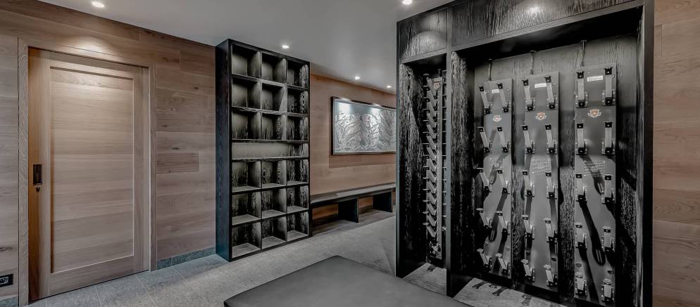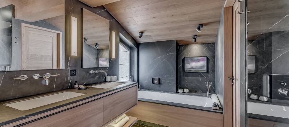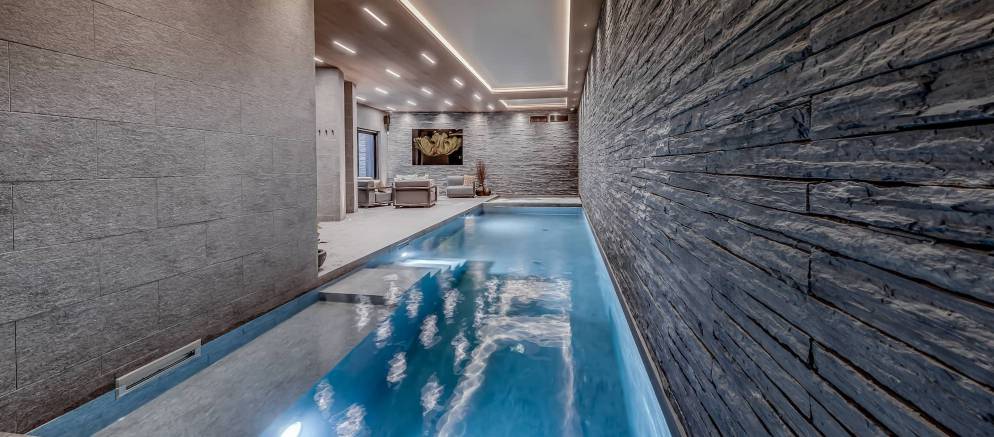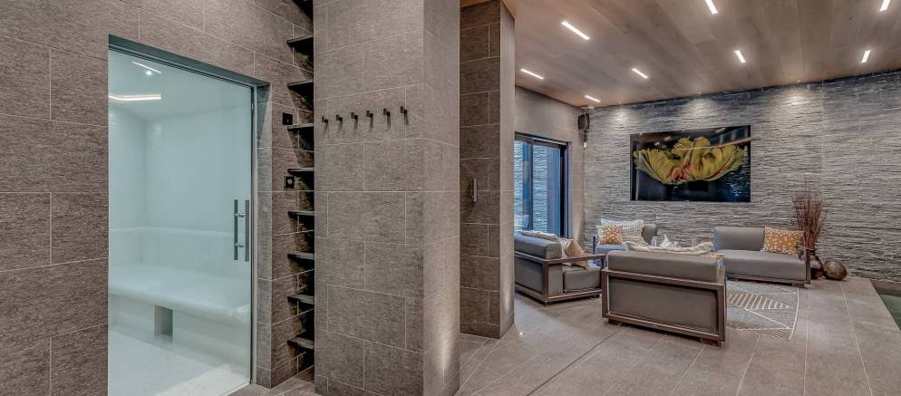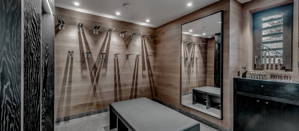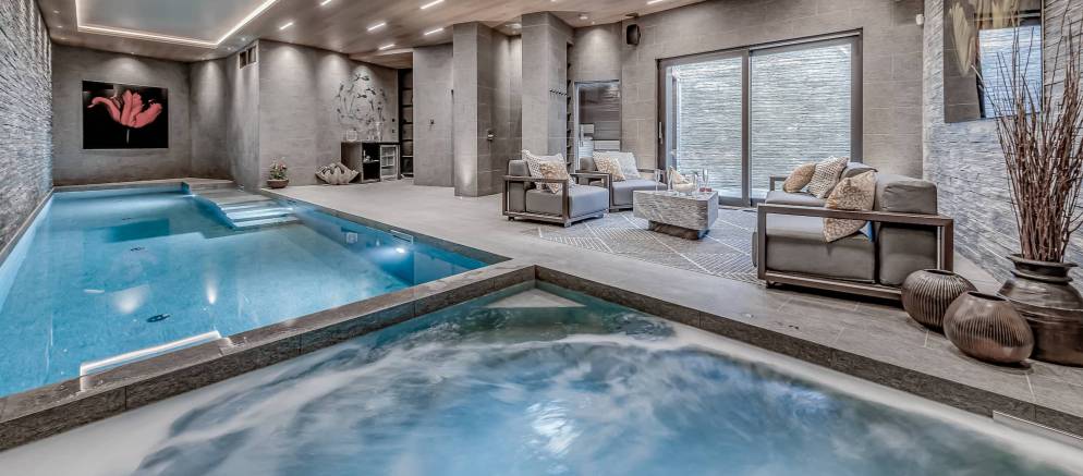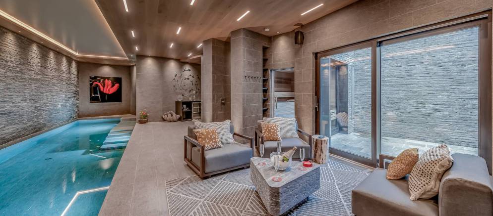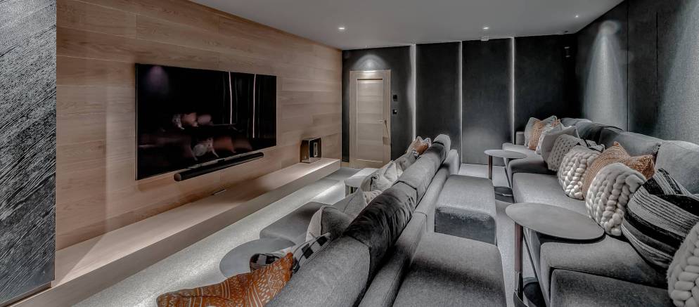 Heading down to the lowest floor of the chalet and this is the place to enjoy some serious relaxation and entertainment. Enjoy a dip or rack up some lengths in the 10-metre indoor swimming pool or unwind in the adjacent sunken jacuzzi. Warm up in the sauna and hammam, whilst floor-to-ceiling glass-doors lead to an exterior private heated courtyard. Down the hallway from the spa is the cinema with generous tiered sofas, whilst one floor up is a dedicated treatment room.