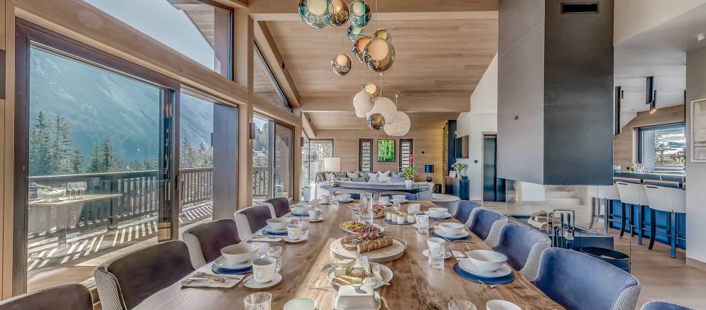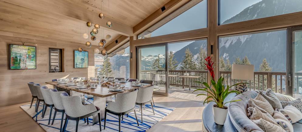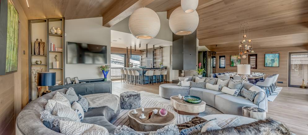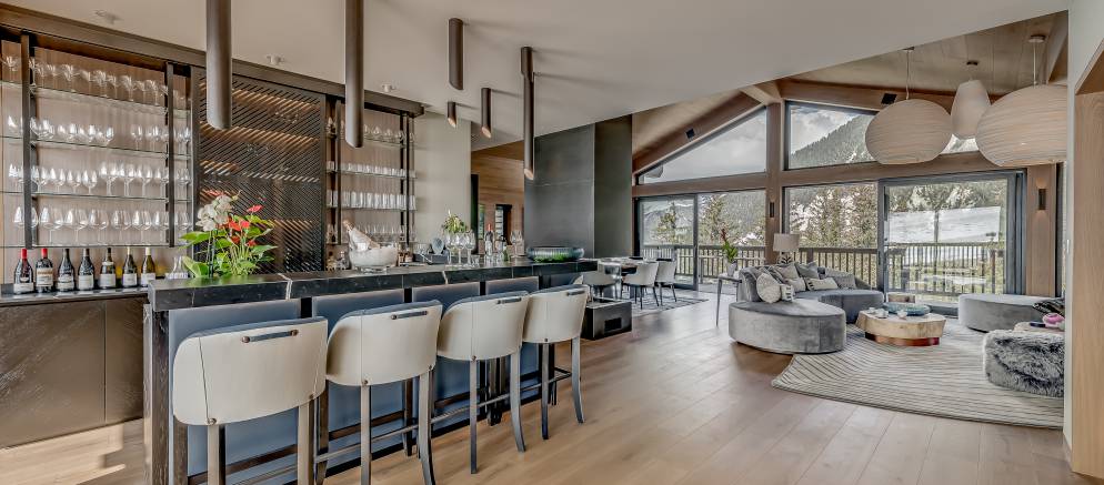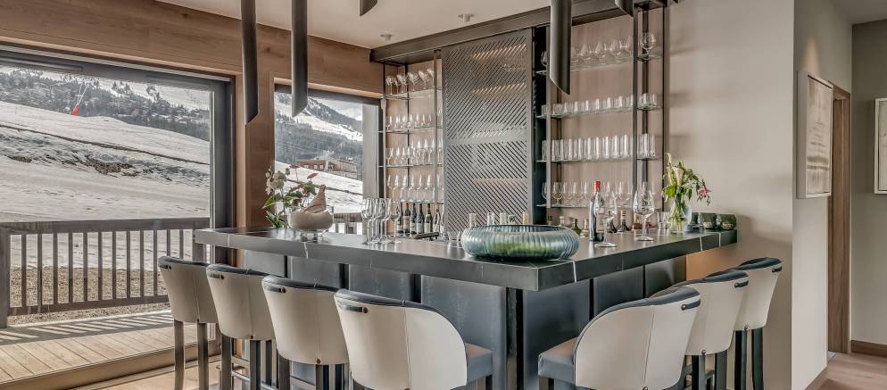 The main living spaces are spread across the second floor with large balconies on two sides. The sitting and dining rooms are set beneath double height ceilings and is a grand setting for evening dinner parties. To the other side of this floor and the large contemporary bar is the place for some pre-dinner drinks, or head outside to the giant hot tub on the balcony and enjoy some private après ski whilst overlooking the slopes.