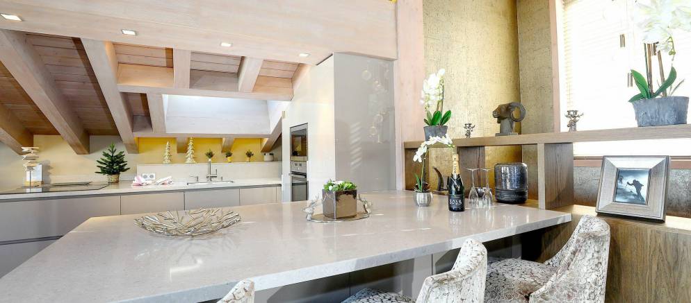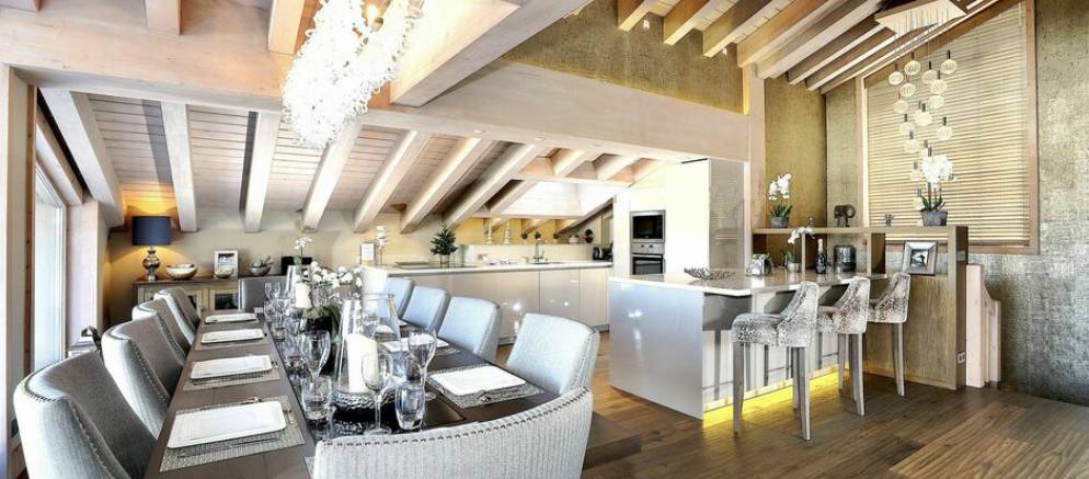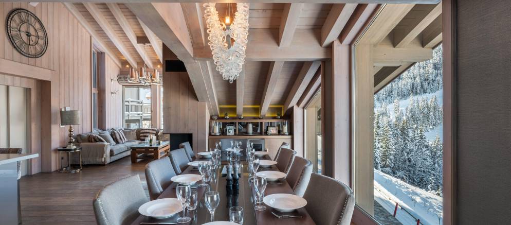 The chalet is arranged over 4 floors and 180m2 of living space with the benefit of elevator access to each level. The top floor offers a spectacular open plan living, dining and kitchen space with high ceilings and stunning views from the numerous picture windows.