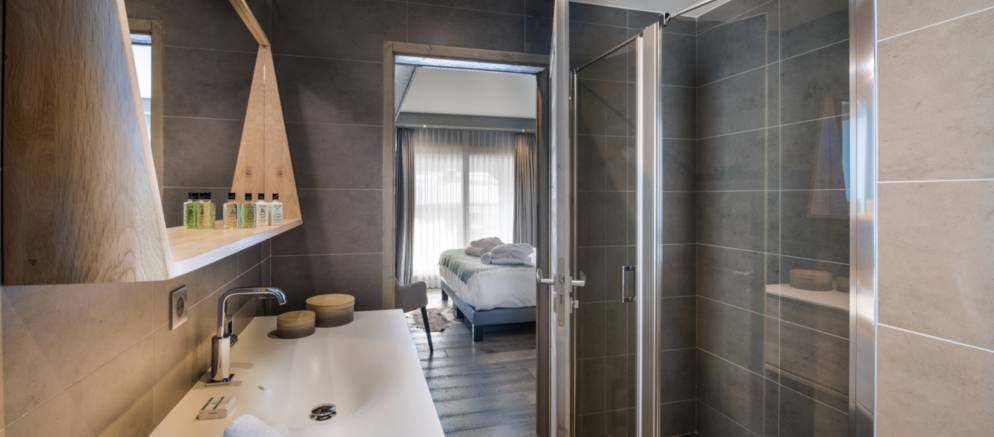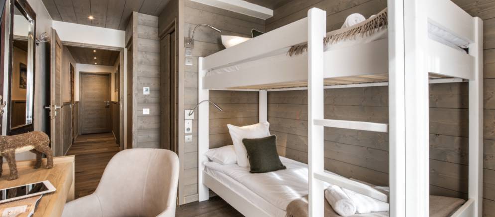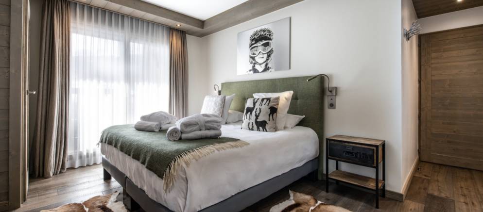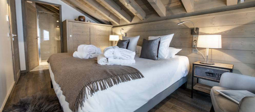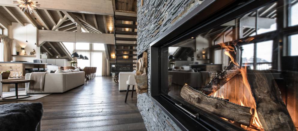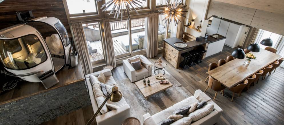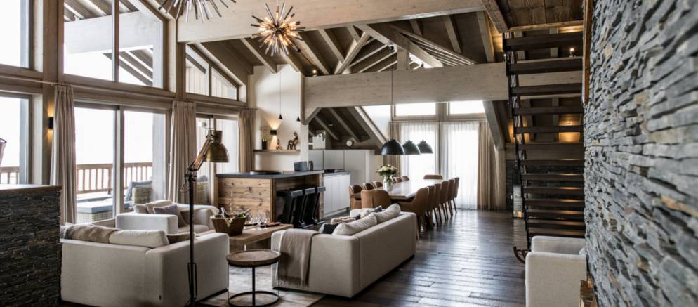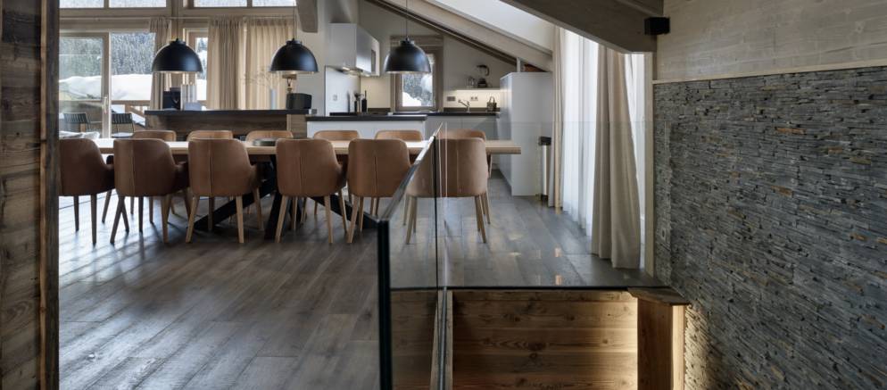 The bright and open plan living space benefits from double height vaulted ceilings that creates a feeling of grandeur. There are three lounge areas with plenty of seating for the whole group and a fireplace for that cosy mountain ambiance. The kitchen faces onto the dining table, allowing budding chefs to show off their culinary skills and to host wonderful evening dinner parties.