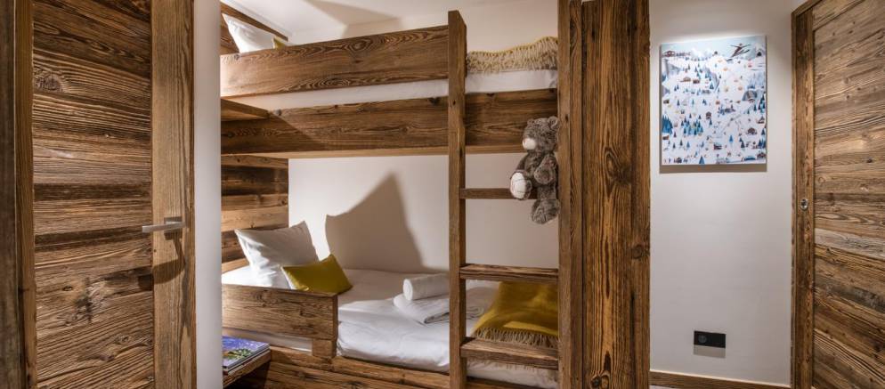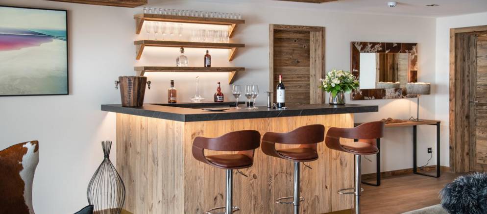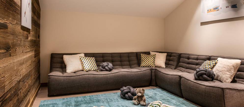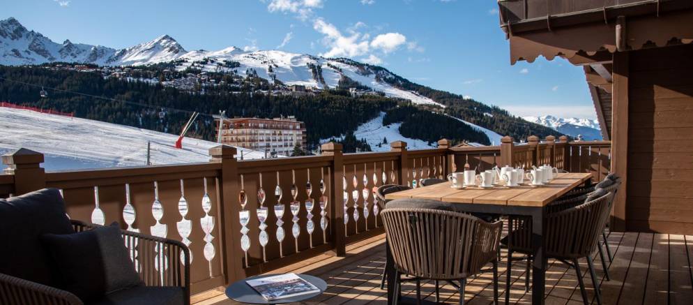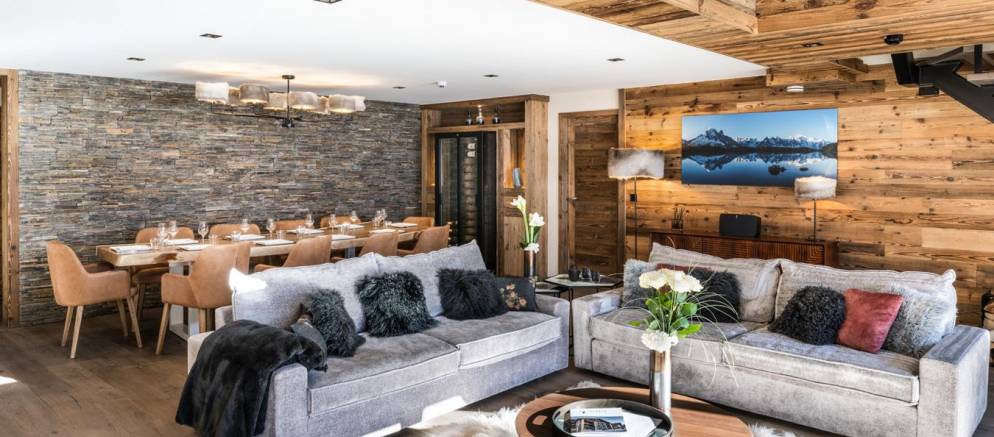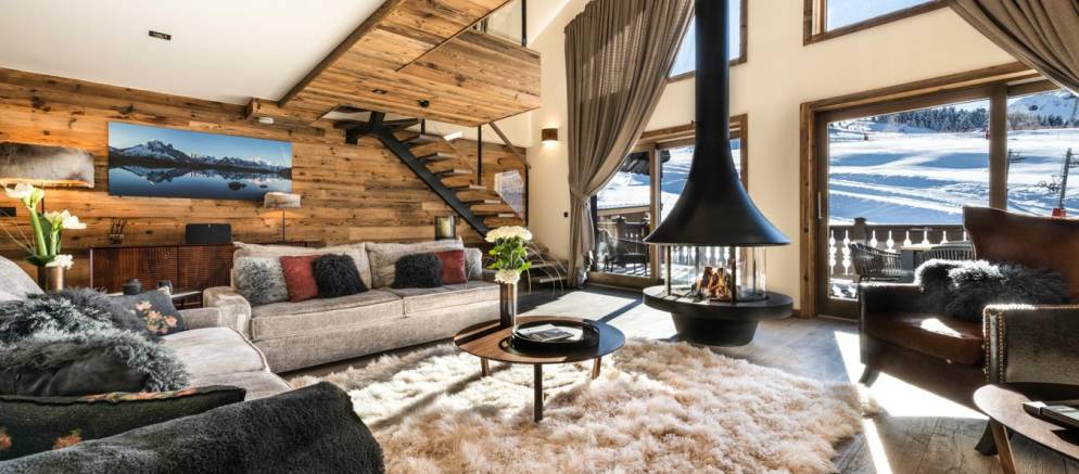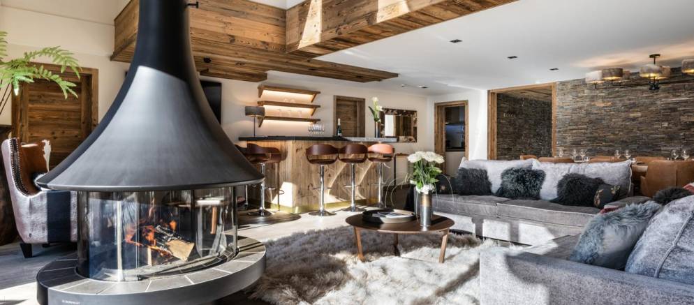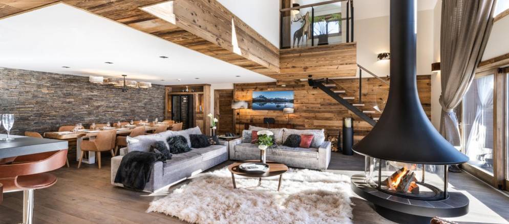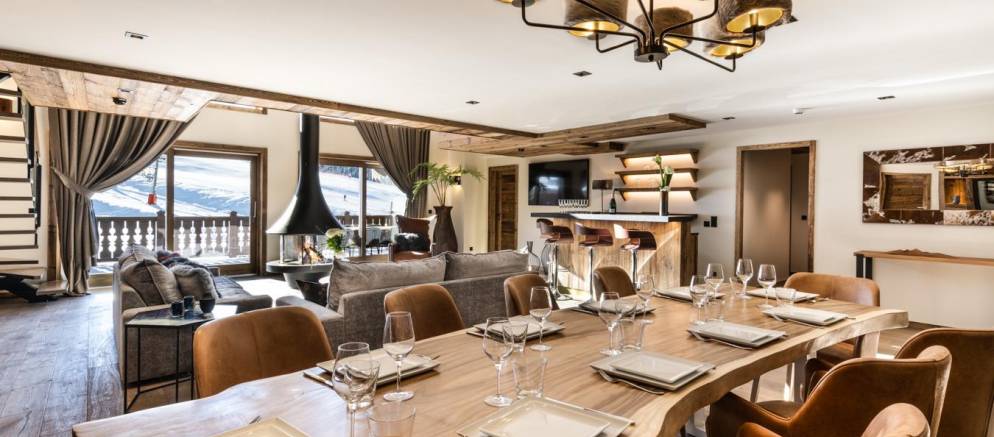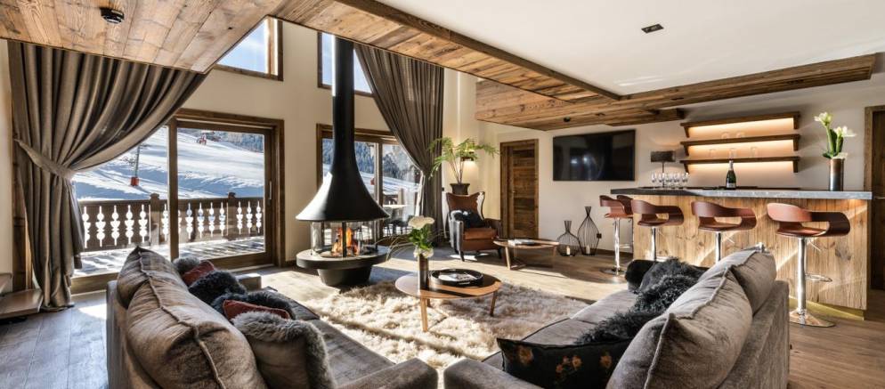 The bright and spacious living room is decked out with comfy sofas and armchairs set around a feature fireplace, a bar area with seating and elegant dining table. The enclosed kitchen is fully equipped and there is also a dedicated TV / cinema room. A wide balcony provides views over the ski slopes of Courchevel 1650 and the Saulire mountain peak.