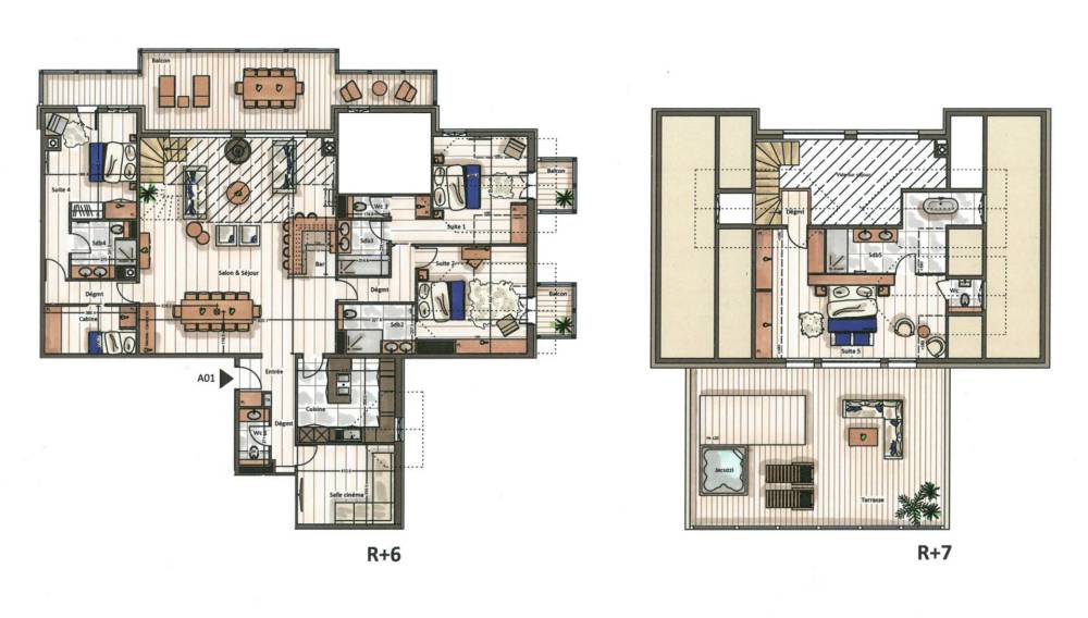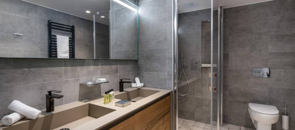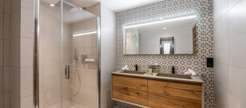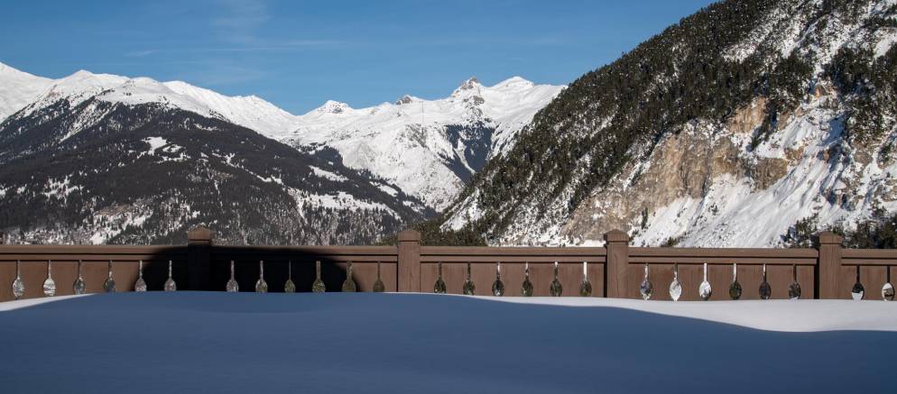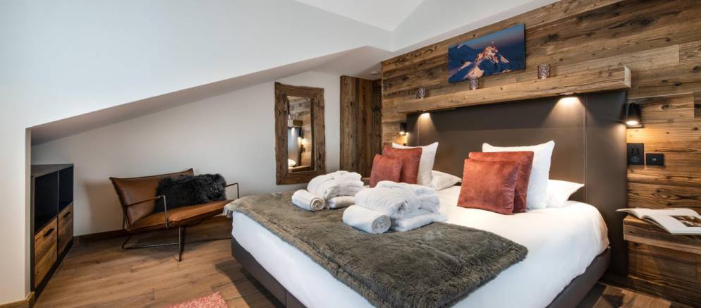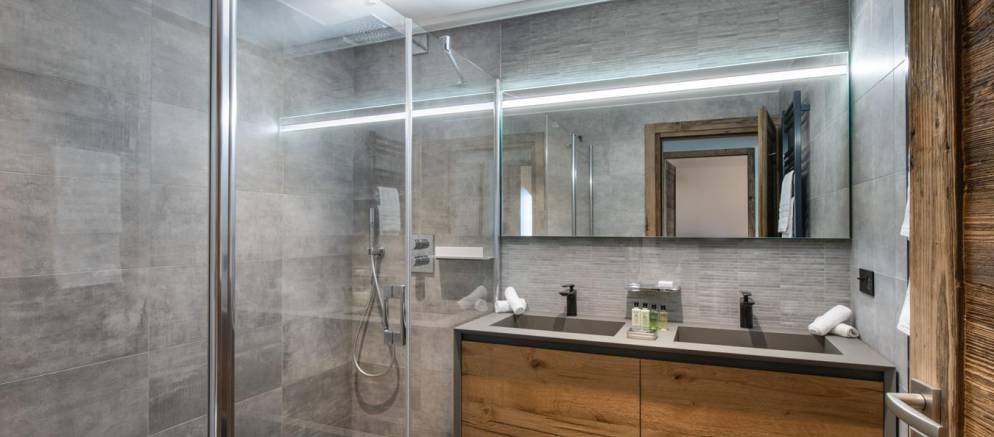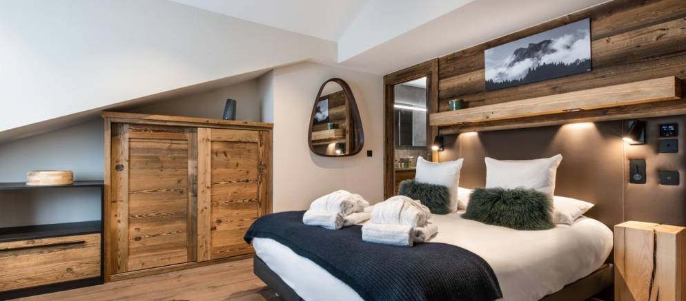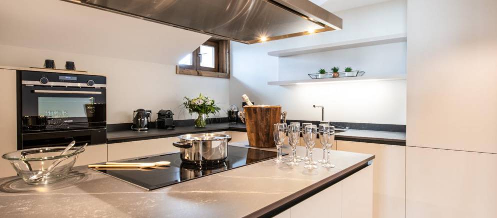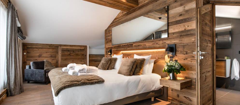 The bright and spacious living room is decked out with comfy sofas and armchairs set around a feature fireplace, a bar area with seating and elegant dining table. The enclosed kitchen is fully equipped and there is also a dedicated TV / cinema room. A wide balcony provides views over the ski slopes of Courchevel 1650 and the Saulire mountain peak.