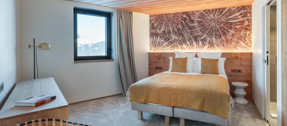 The Castano apartment is located on the 2nd floor of the residence. The interior harmoniously blends contemporary design alongside the use of typical Alpine materials and neutral colours. The open plan living room features a lounge, dining area, and kitchen, along with a corner fireplace. Large windows and French doors flood this space with natural light and views over the ski slopes, which can also be enjoyed from the wide balcony.