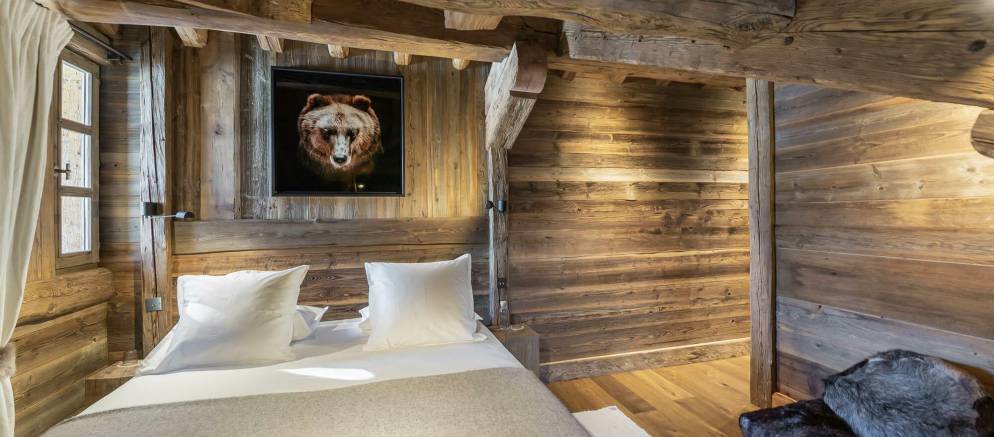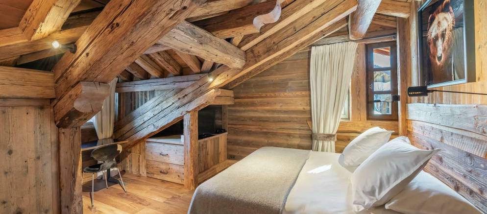To the first floor there is a double bedroom with en-suite bathroom. The top floor of the chalet is dedicated to the en-suite master suite. This beautiful and charming room is a haven of peace and tranquillity. Tucked away under the beautiful wood roof, it is the epitome of traditional chalet charm and the windows offer panoramic mountain views.