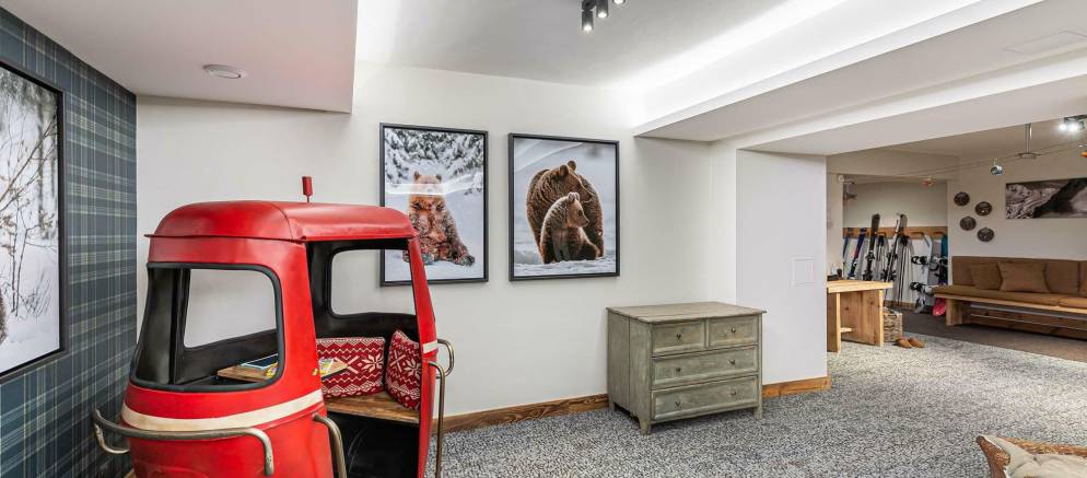 The elegant living and dining rooms are located on the first floor. The double height ceiling lends to the feeling of grandeur and space. With plentiful comfy seating arranged around the wood burning fireplace, the whole group can enjoy each other’s company after a day’s skiing.