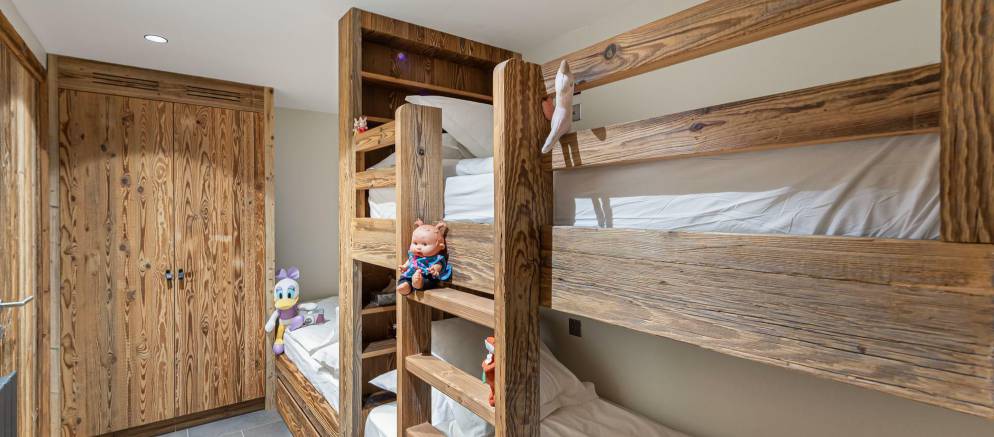 The chalet is arranged over four floors and 450m2 of living space. Sleeping 10 adults and 5 children the 7 bedrooms are arranged between the four floors. On the lowest level there is an en-suite triple bunk room, on the ground floor there are three double or twin rooms all with en-suite bathrooms plus a bunk room perfect for 2 children with an en-suite shower room.