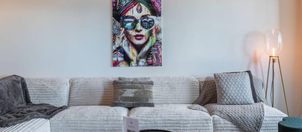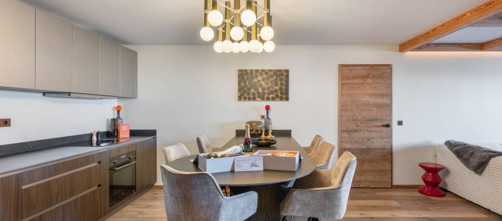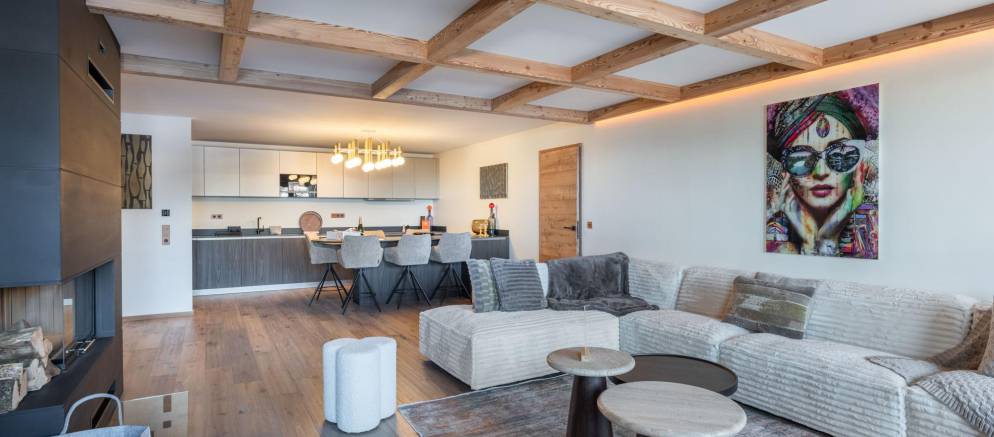 The Intresso apartment is located on the 3rd floor of the residence. The interior blends contemporary design alongside the use of typical Alpine materials, neutral colours, and soft fabrics. The open plan living room features a lounge with fireplace and TV, plus a kitchen with island unit / breakfast bar seating 6. Large windows and French doors flood this space with natural light and views over the ski slopes, which can also be enjoyed from the wide balcony.