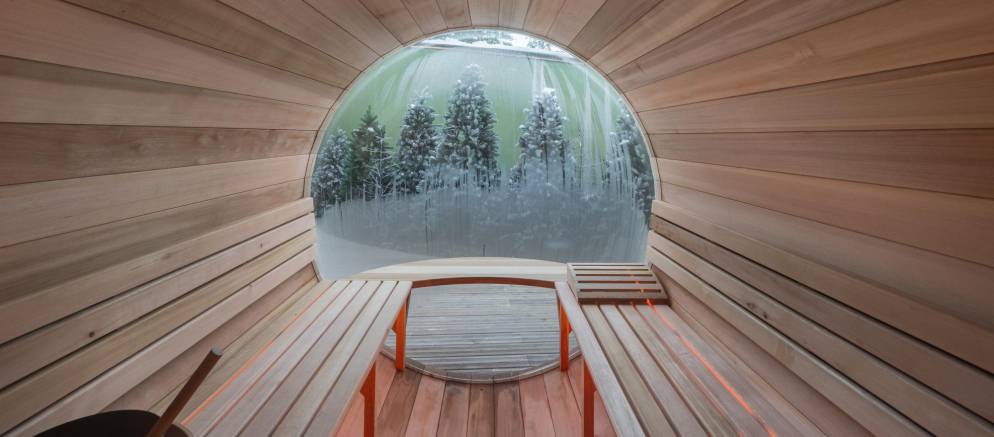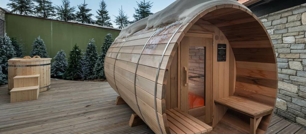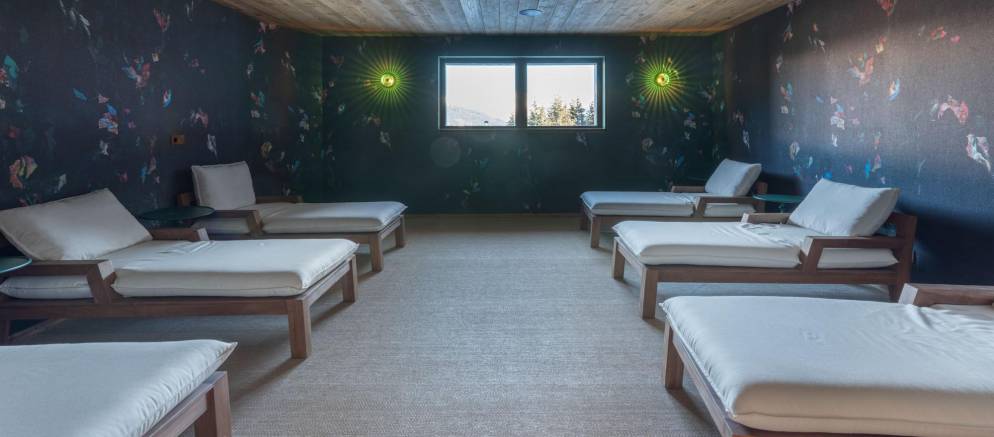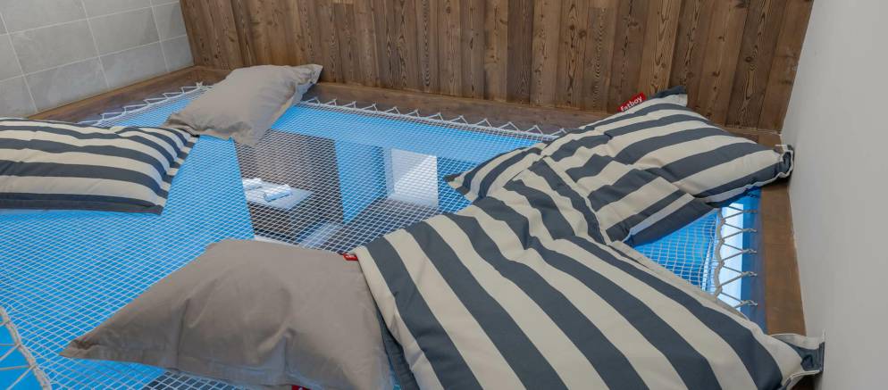 Step outside onto the large terrace planted with fir trees and enjoy the warmth of the barrel sauna or sink into the waters of the Nordic bath. Head upstairs and you will pass the enchanted forest area with indoor fir trees with fairy lights. Here you will find a further shower, along with a relaxation area with day beds, plus a further relaxation area suspended above the swimming pool.
