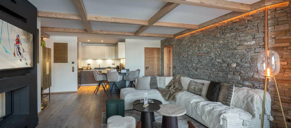 The Nettuno apartment is located on the 4th floor of the residence. The interior blends contemporary design alongside the use of typical Alpine materials, neutral colours, and soft fabrics. The open plan living room features a lounge with fireplace and TV, plus a kitchen with breakfast bar seating 6. Large windows and French doors flood this space with natural light, and you can step outside to the wide balcony and enjoy the views over the ski slopes.