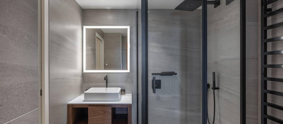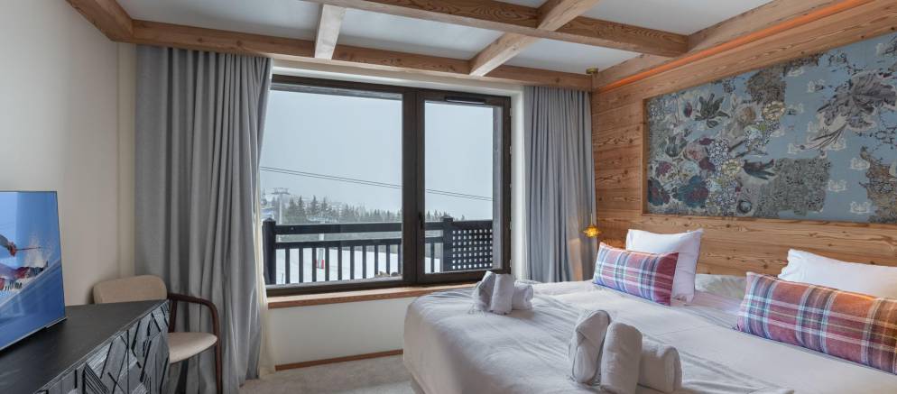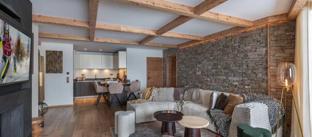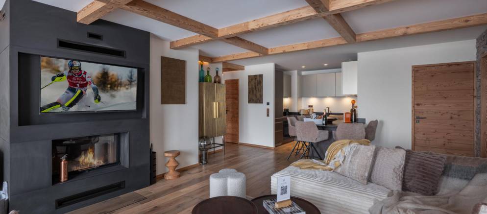 The Oro apartment of 86m2 floor area is located on the 4th floor of the residence. The interior blends contemporary design alongside the use of typical Alpine materials, neutral colours, and soft fabrics. The open plan living rooms features a lounge with fireplace and TV, plus a kitchen with breakfast bar seating 6. Large windows and French doors flood this space with natural light, and you can step outside to the wide balcony and enjoy the views over the resort and ski slopes.