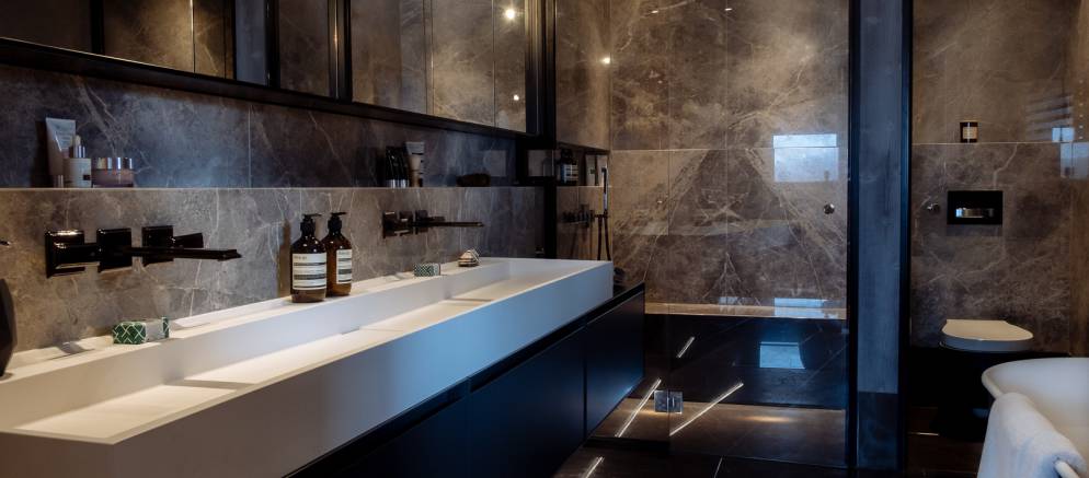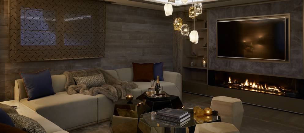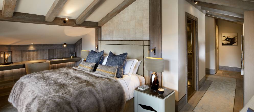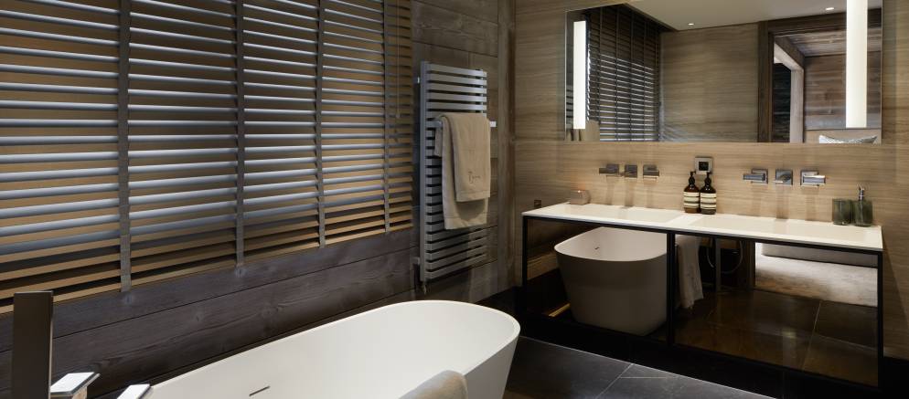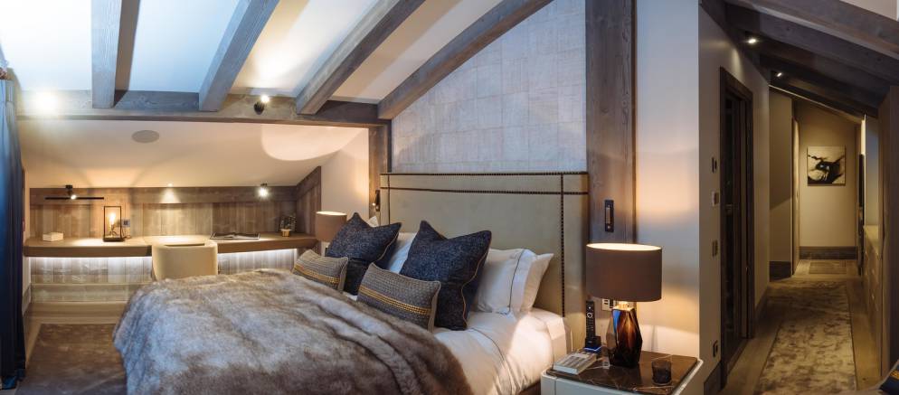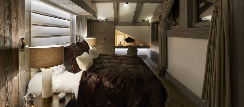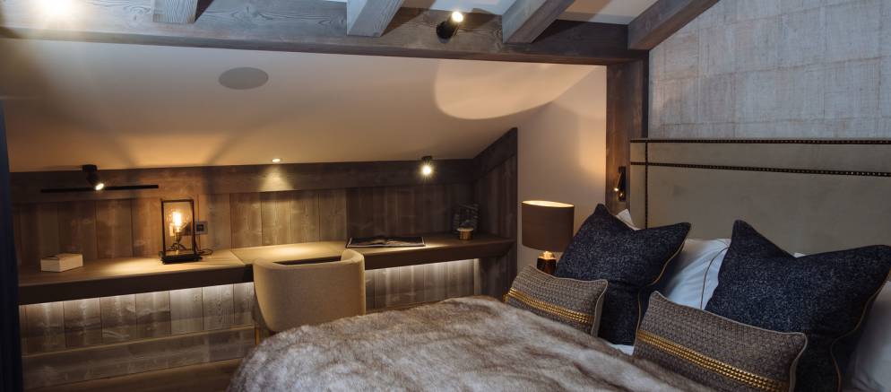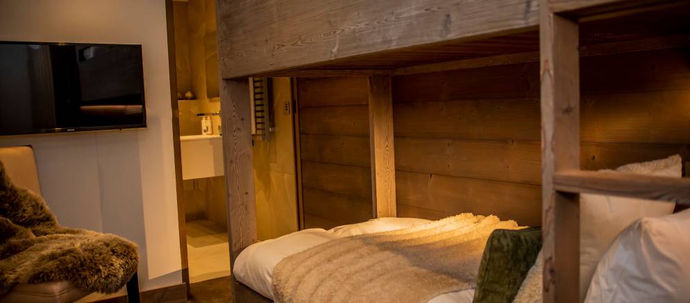 The property can accommodate up to 10-12 guests in six en-suite bedrooms. There are two bedrooms on the top floor, including the Master suite featuring a pop-up TV system extending from the foot of bed, along with breathtaking views of the Alps. The other four bedrooms, 2 doubles and 2 bunk bed rooms, are located on the ground floor. The rooms are indulgently decorated with soft, warm fabrics and filled with rich brown chocolate and timber tones.