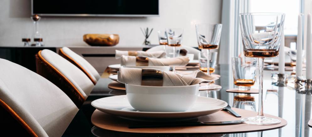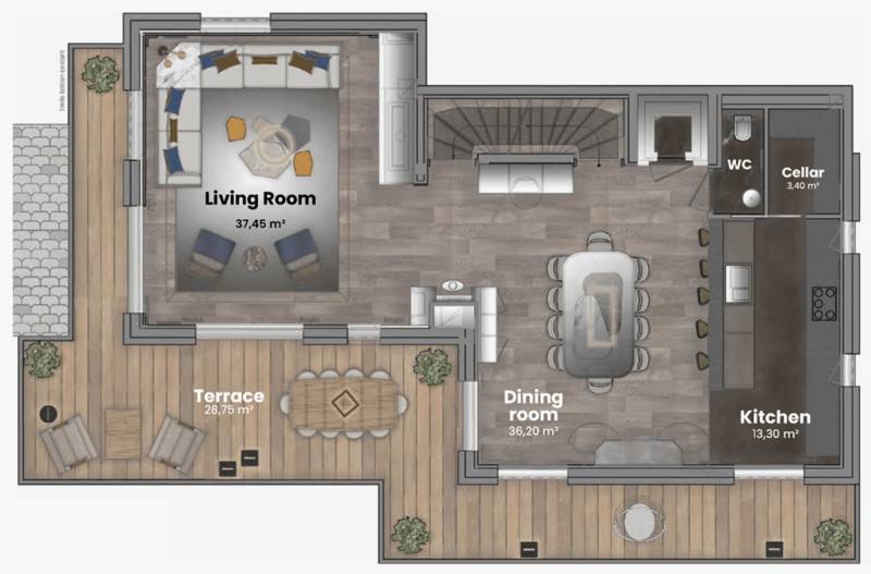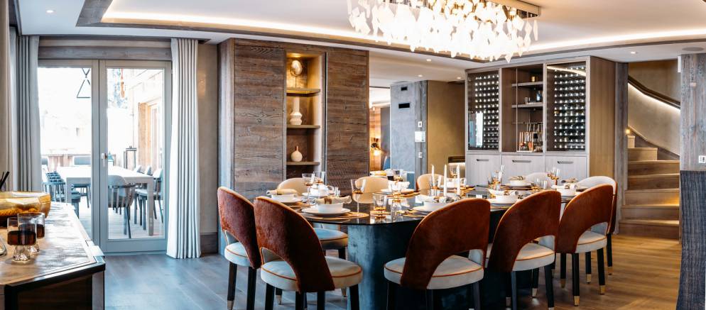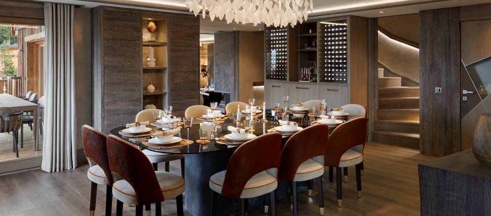 Arranged across three floors and 426m2 of living space all floors are connected by both stairs and an elevator. On the middle floor the open plan living & dining rooms provide the perfect space for entertaining with a generous seating area. A bespoke wine cellar leads on to the grand dining room and wide terraces provide the ideal spot for outdoor dining or simply taking in the mountain views.