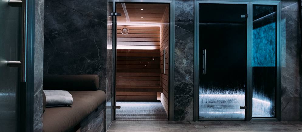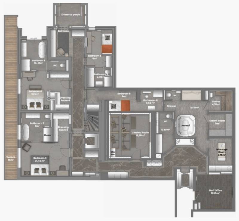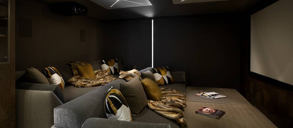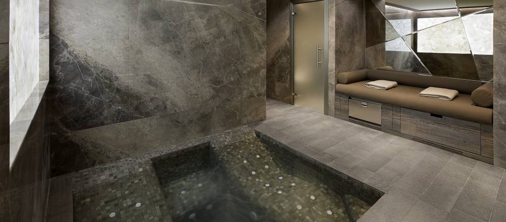 Also on the ground floor are the private spa and entertainment facilities with an indoor Jacuzzi, sauna, hammam, massage room, gym, and cinema room. There is also an option to turn the Jacuzzi into a cold plunge.