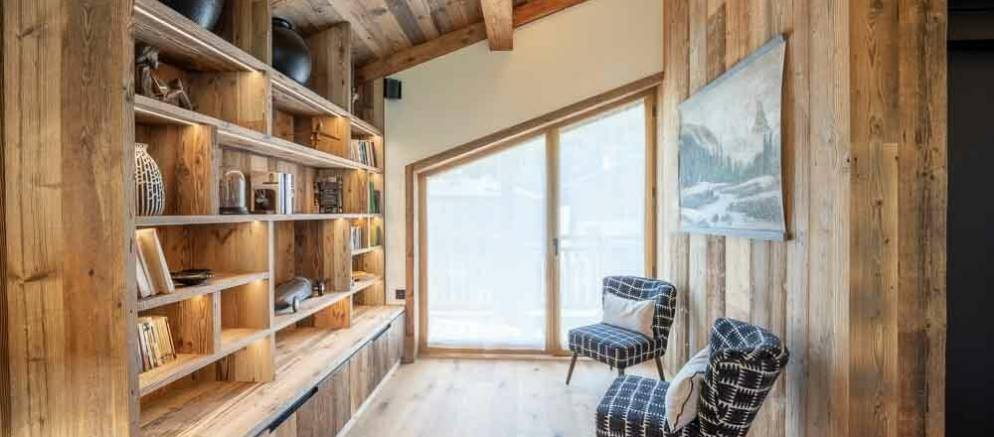 The chalet is arranged over four floors and 270m2 of floor area served by both an elevator and stairs. The top floor features high ceilings, dramatic lighting, and a central fireplace, and is home to the communal living spaces. To one side is the sitting area with large comfy sofas, flat screen TV, as well as a cosy reading area. On the other side is the dining table and kitchen with breakfast bar. Balconies are accessible along both sides of this floor.