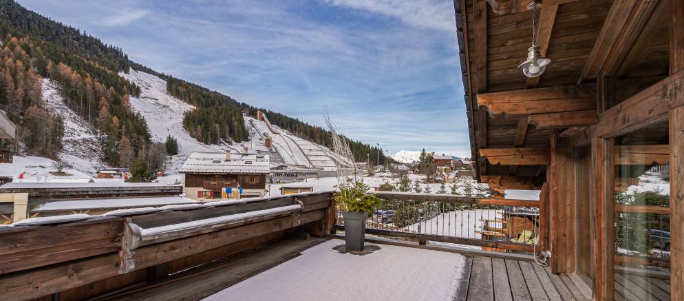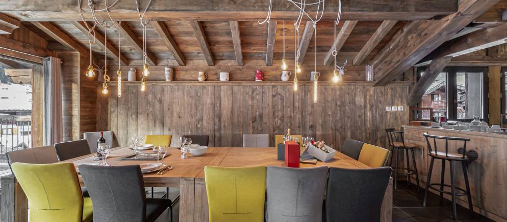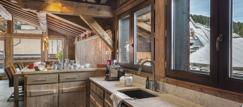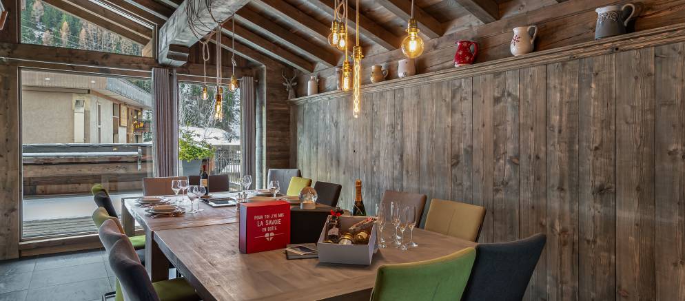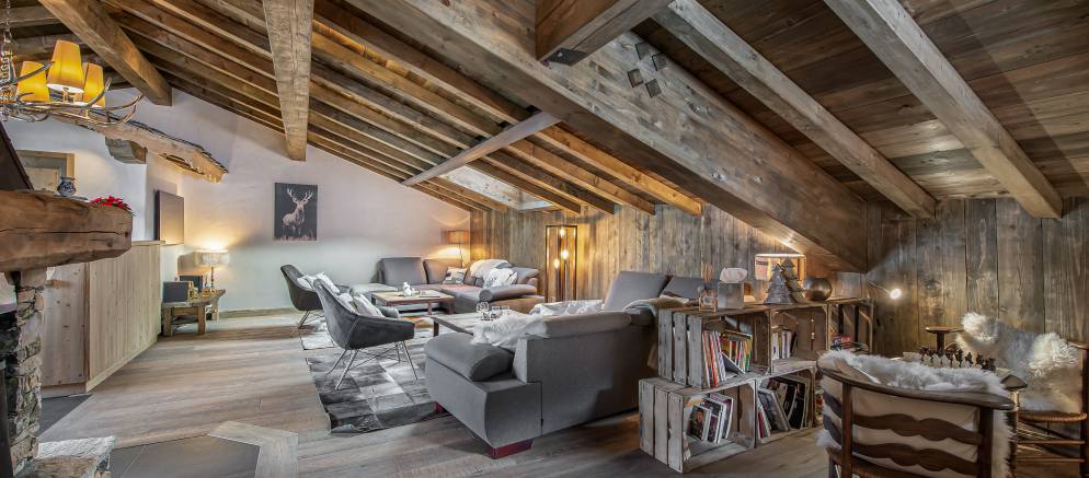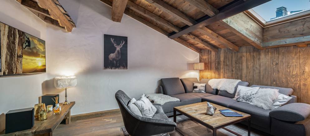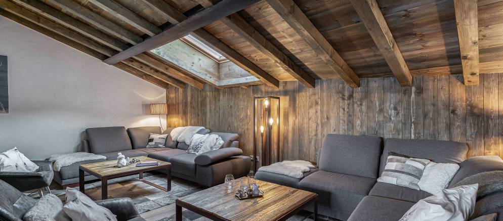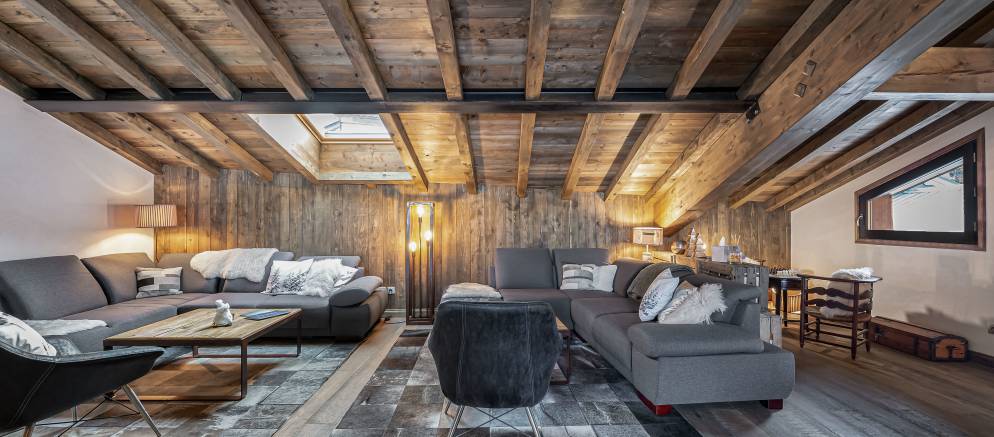The spacious and charming living room is situated on the second floor. Here there is direct access to the terrace, offering you a magnificent panoramic view of the Courchevel ski resort, ideal for having breakfast in this exceptional place.